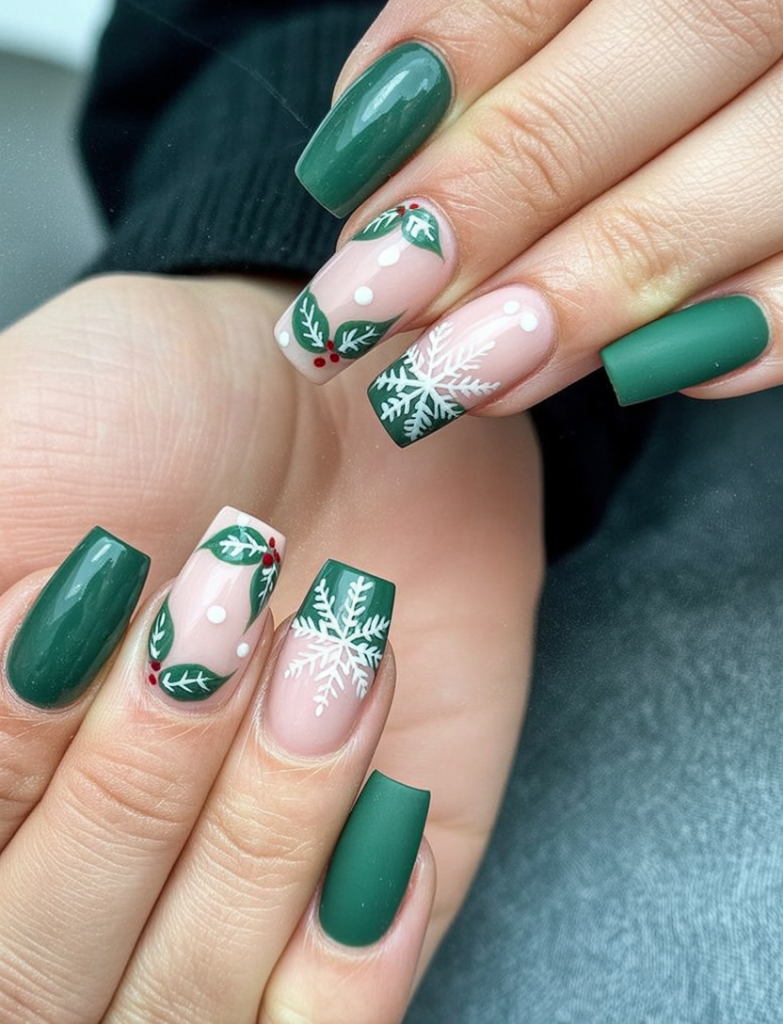 This design is for women who revel in themed nail art done to a glossy finish. The green polish adds depth, while the holly and snowflakes scream seasonal charm. It goes well with anything soft like red knits or gold embellishments, making it a delightful option for casual Christmas parties.