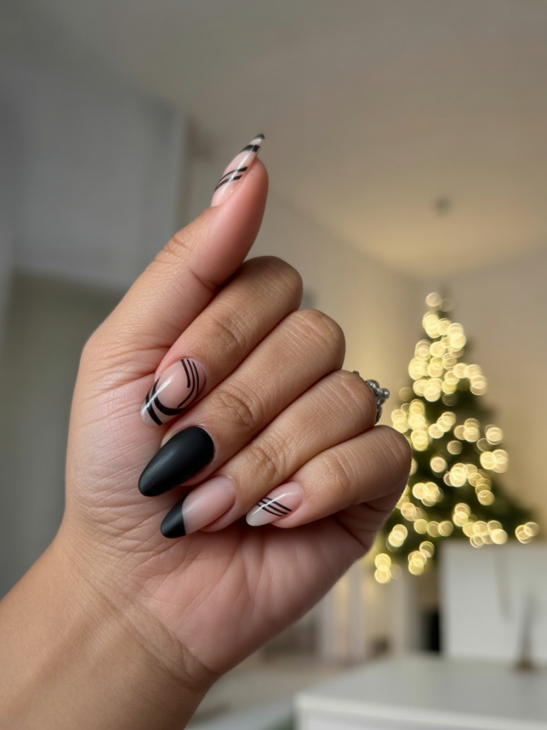 Nail sleek and edgy, matte black polish is paired with nude bases adorned with fine black stripes. It is a modern yet minimalistic holiday take on style that appears chic and totally unexpected. It’s a little festive for someone who likes understated elegance.