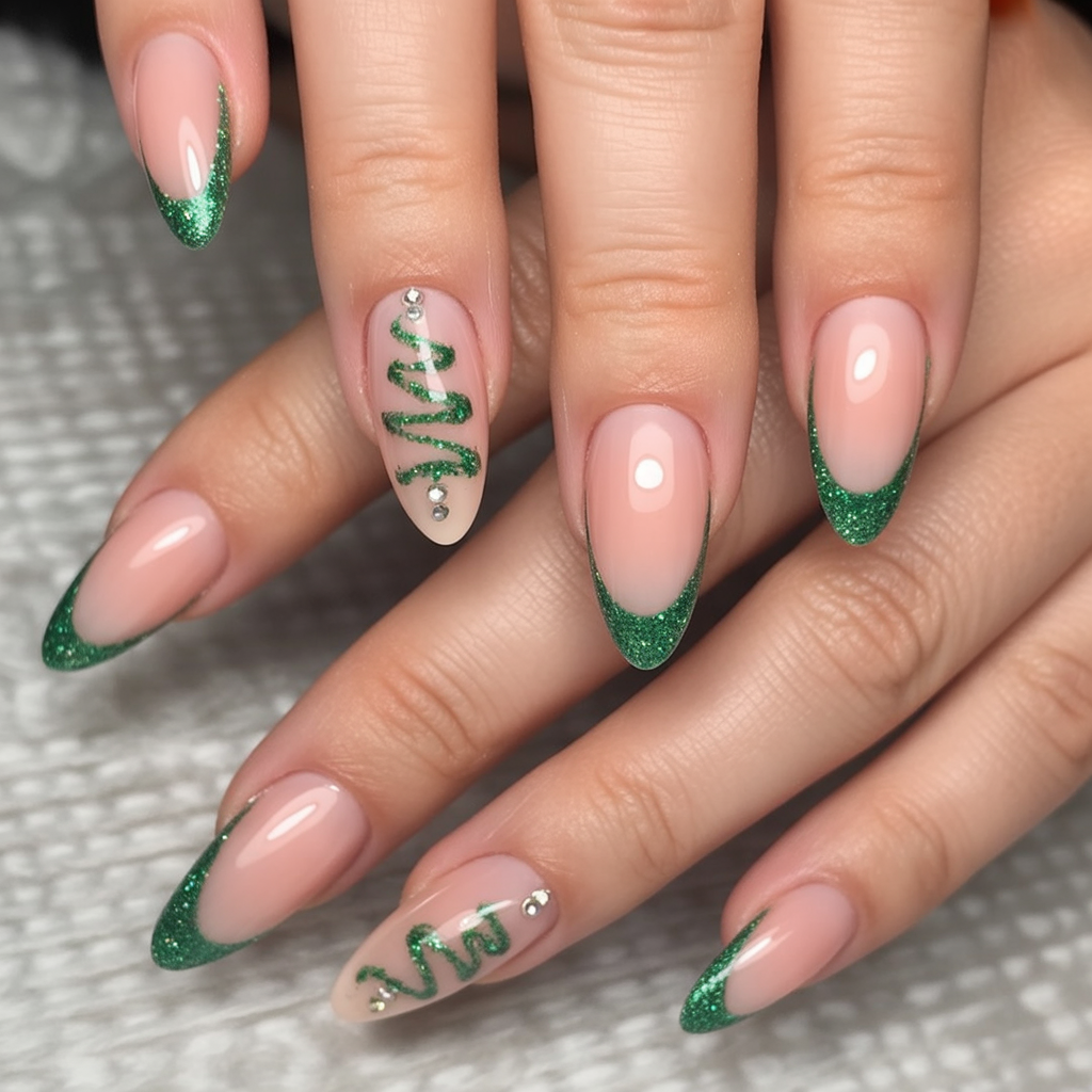 5. Sparkly Green Almond Tips with Christmas Tree Accent