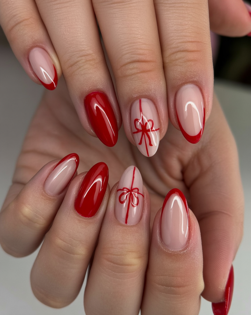 These nails look like tiny holiday presents tied up with the prettiest bows. The glossy red and nude base contrast creates a clean, sophisticated look while the bow accent art adds a playful, gift-inspired twist. It’s the perfect mix of festive cheer and chic elegance, making your nails feel like part of the holiday décor themselves.