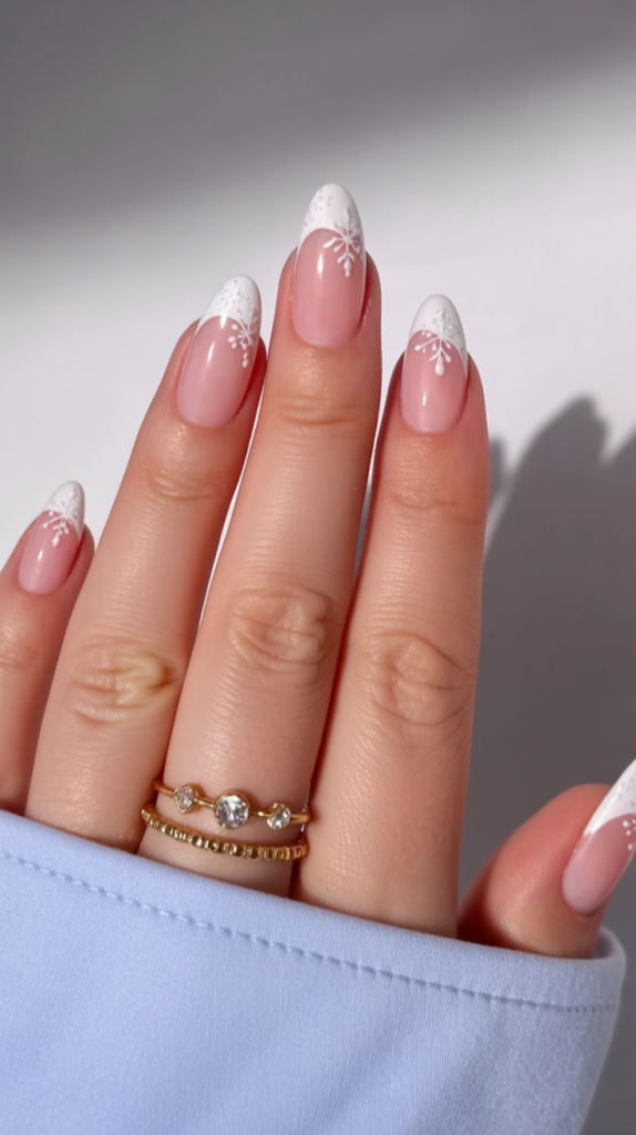 7. White Snowflake French Tips on Almond Nails