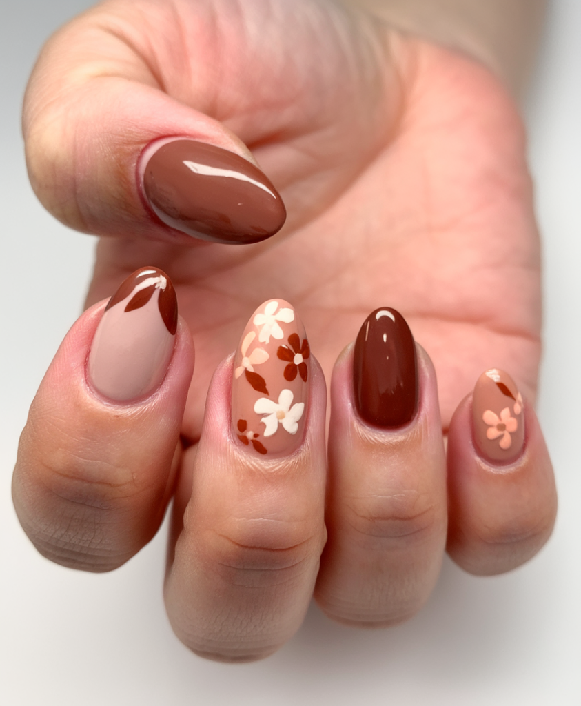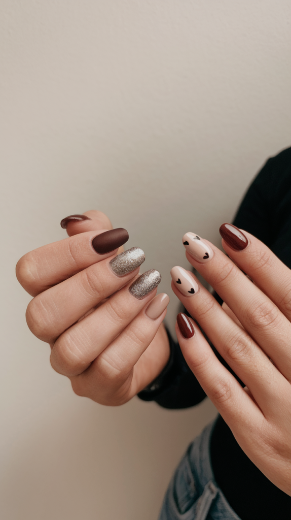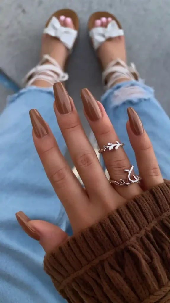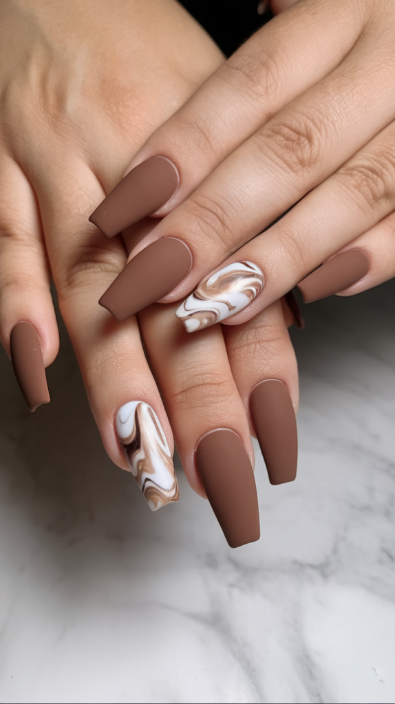 It is just so fall-ish and cool and so chic when it comes to matte mocha nails: warm, comfy, and somehow bold. The ring fingers have the swirled marble making a feature with the luxurious, artistic touch that feels like it is out of some fancy coffee shop. This ensemble is the perfect combination of both comfort and confidence and this ensemble will leave you feeling like drinking a spiced latte in a nice knit cardigan.
