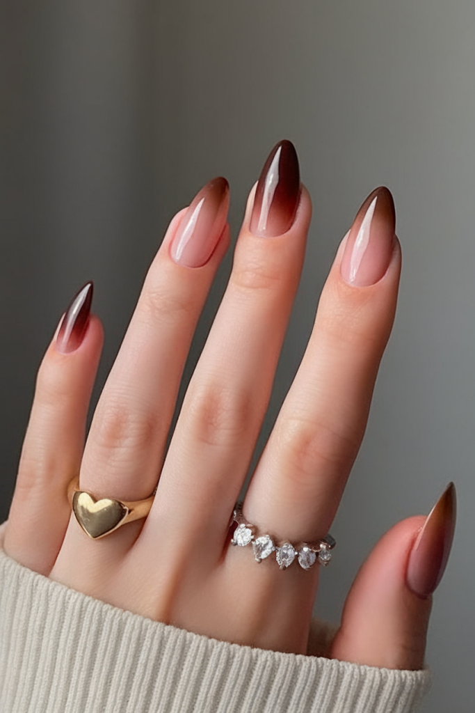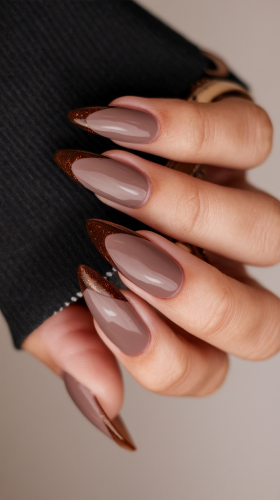 10. Chocolate Almond Nails with Sparkling Copper Tips