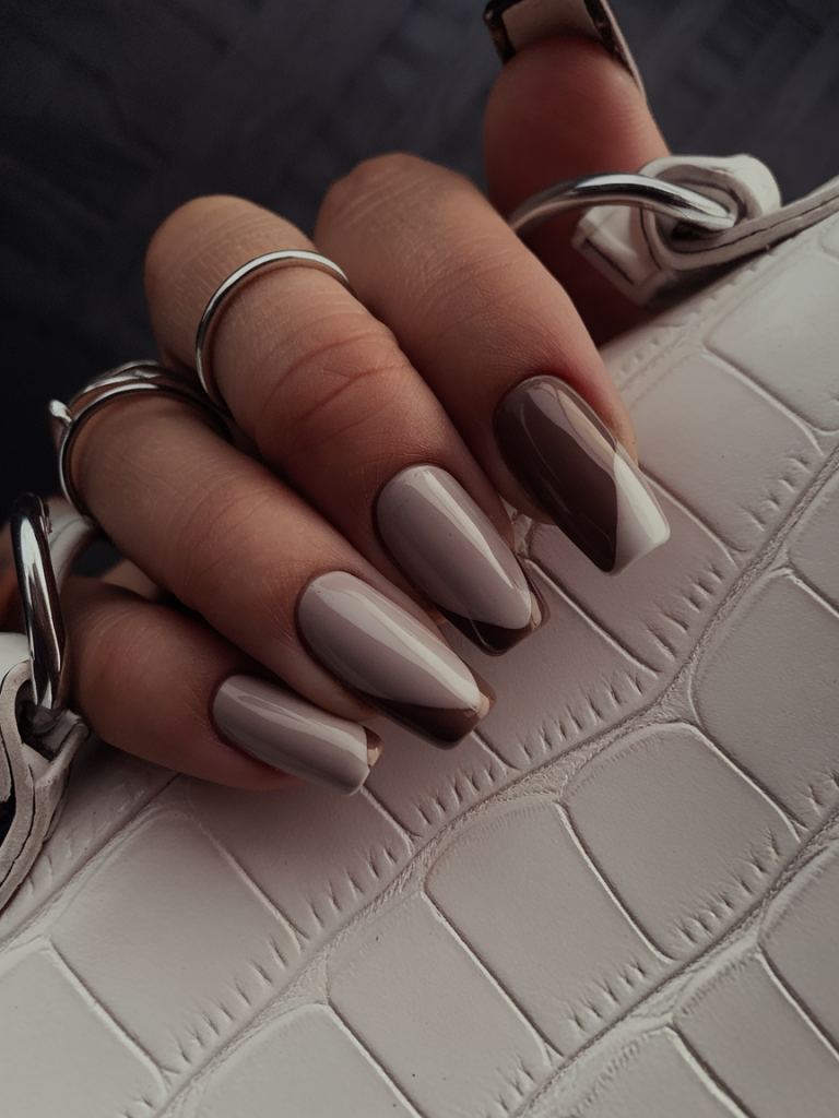A well-designed style that is both timeless and not dull, this is what occurs when the sun-baked caffeine hues encounter the buttery beige hues in an oblique french tip scenario. The glossy finishing gives the effect of being just polished and the other diagonal cut on the tip gives it structure and modernism.