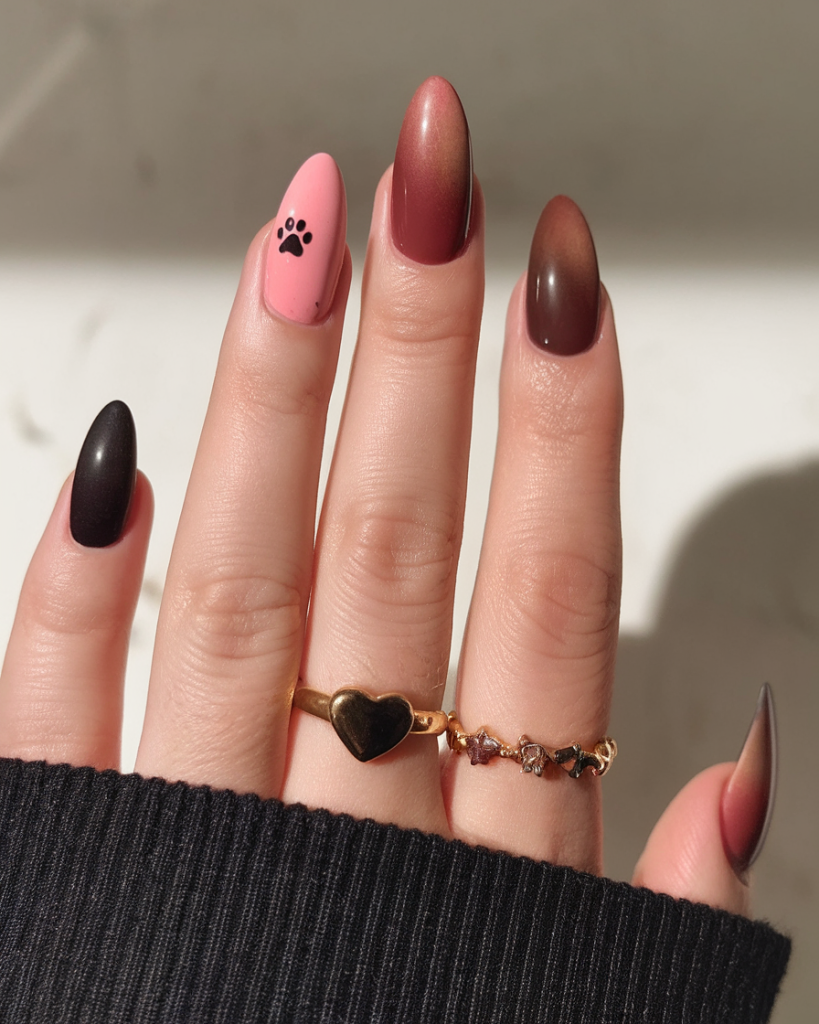 It is also done in bold brush strokes and seems quite playful, which immediately lightens the mood. The dreaminess of the soft matte ombr stuck in autumnal hues makes it beautiful in itself but then there is the surprise of the pink in the combination of it and the very small paw print just to keep things quirky. It is as though it is a nail colour that comes with the personality and is meant to be worn on a comfortable weekend afternoon and during those pumpkin pie time.