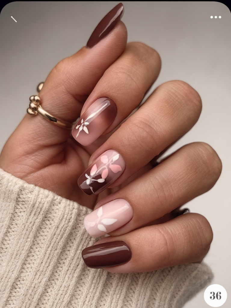 This manicure is similar to walking through a park with foliage, at the end of October. Deeper shades of burgundy contrast with light blush, all harmonized by the touch of beautiful leaf-like accents presented in pink and white. It is a womanly color, and warm, and fall-ish, without being sleek, like swaddling yourself in the perfect scarf.