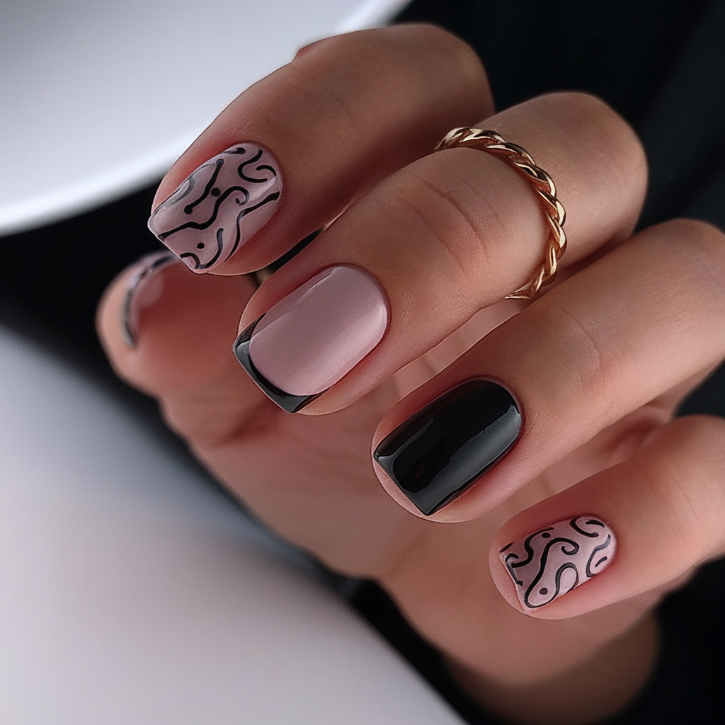 This manicure strikes the right balance between the liking of contrast and clean design by the woman who likes it. With black abstract squiggles and a dramatic black accent nail the nude base should get a high-style top. It is new and art-like and very wearable, just the right touch of a black turtleneck.