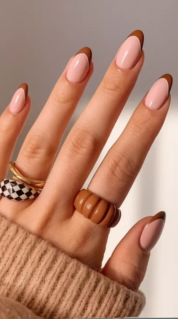In case you prefer minimalist autumn nails and yet want your fingernails to allude to something edgy, this almond style will give you the best of both worlds. It fits well on medium-length and longer nails as well as it looks wonderful with layering rings. It can be compared to a modern update of french tip styles, but with a hint of a wink.