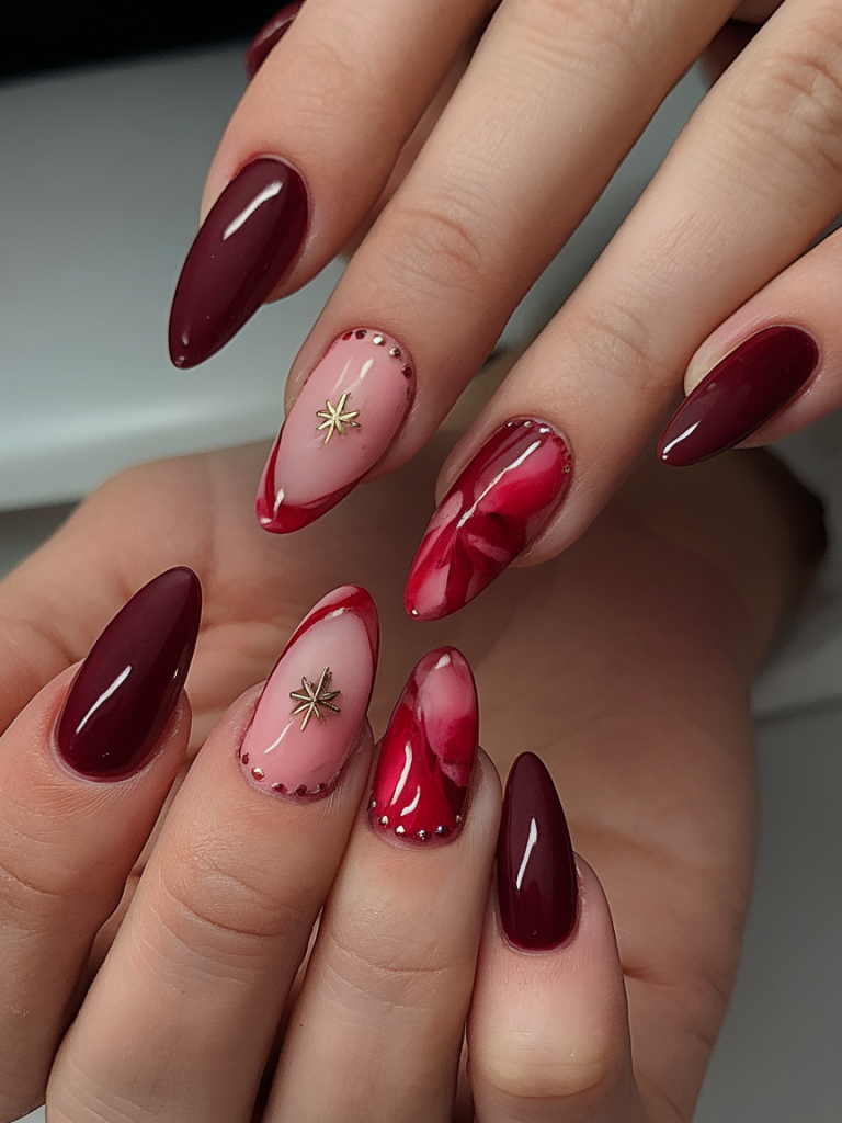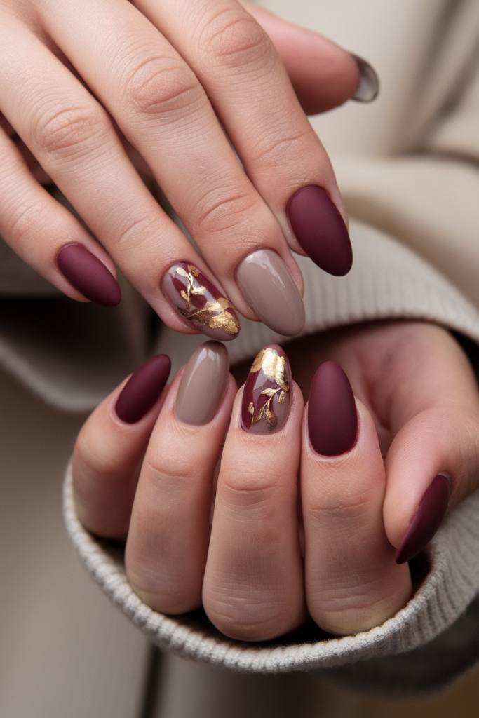 16. Matte Burgundy and Gold Leaf Almond Nails