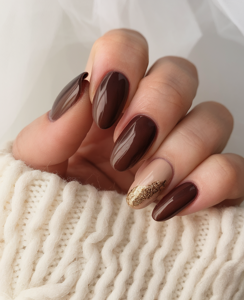 This rich chocolate manicure is pure cozy glamour. The dark espresso hues create emerald fall feels, but the gold foil on one of the nudes nails just gives these nails the perfect amount of glimmer–like the flames on a clear October evening.