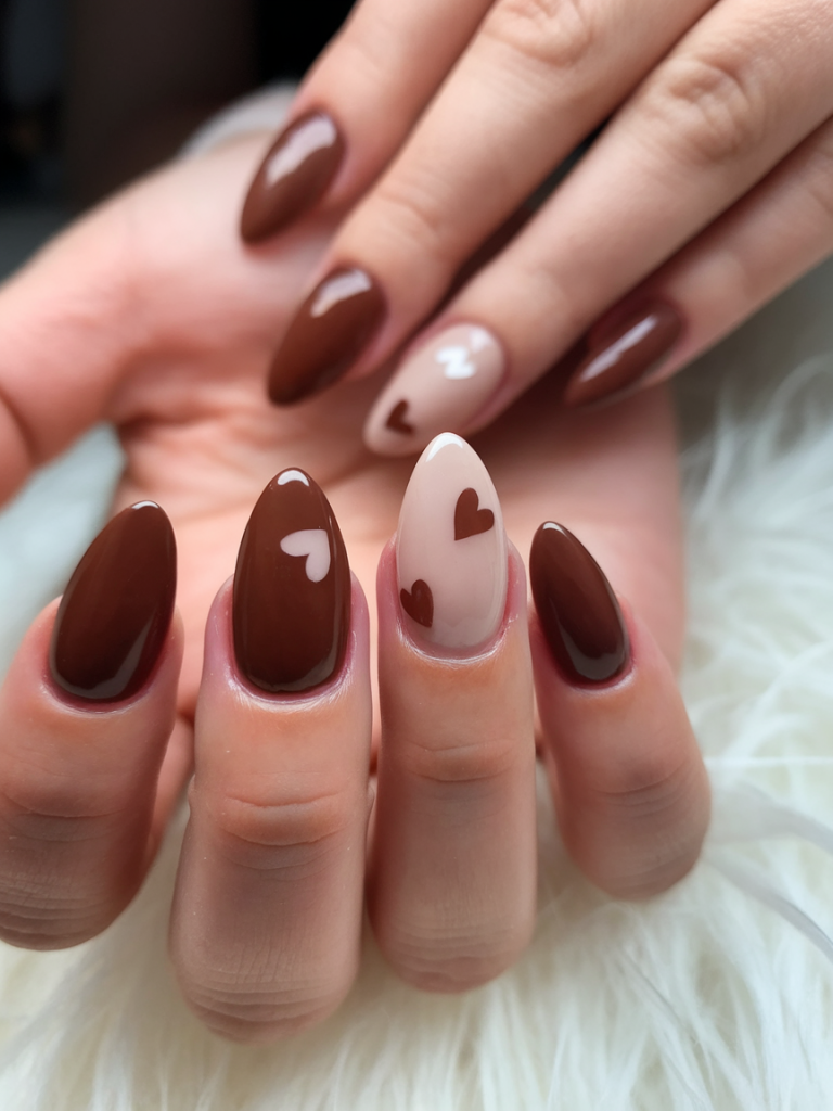 Playful yet elegant, this manicure makes hearts feel grown-up. This nail look is just as sweet as it is sexy, featuring chocolate brown tones on almond shape nails with nude bases chocolate brown nails and heart accents. It is the type of set that is enough to arouse a smile each and every time you glance over at your hands, not over a contrived attempt of being romantic.