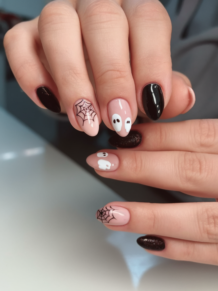 Who says spooky can’t be adorable? The short nails on the diagram have a feminine blush pink shade combined with glossy black and cute Halloween patterns – think small ghosts and web art that is more playful than scary. It is the optimum seasonal tribute, without getting into the further stretch into costume.