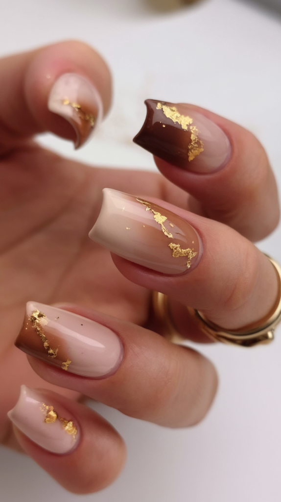 This design is luxury in its most subtle and delicate manner. Creamy nudes turning into richest autumn brown French tips, they each are punctuated with minuscule flakes of gold foil that reflect the light with the same kind of beauty that soft leaves reflect upon golden sun. It’s glam, but with restraint — perfect for fall’s quieter elegance.