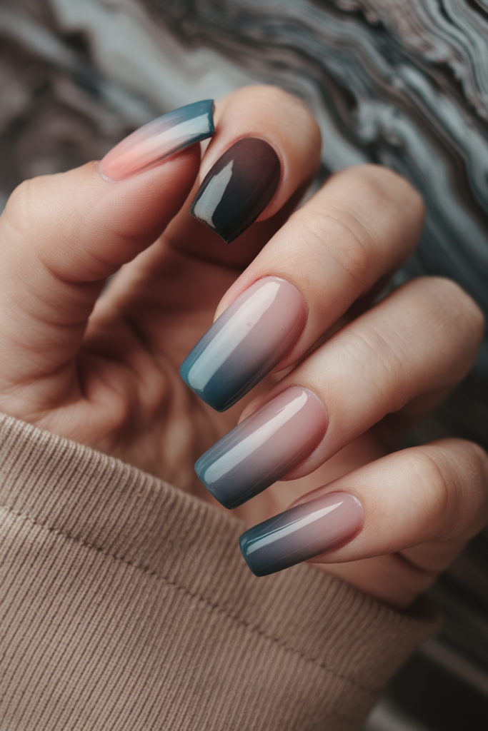 Moody meets magical in this rich gradient design. The layers of soft quasipink blend into the abyss of the teal-blue in a seamless ombr on that seems to have its clouds burning to the sunset. The contrast is subtle and eye-catching at the same time: this is exactly what anyone can go in terms of want their nails to be a surprise.
