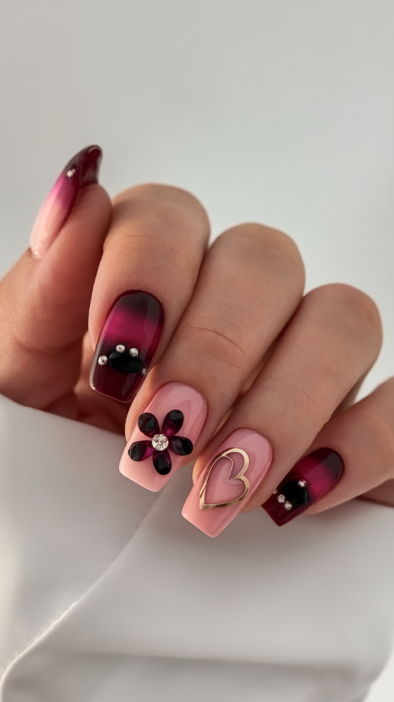 It is as though this manicure is a love poem written on nail. The deep burgundy complements the softly blush pink with enough contrast to be dramatic and yet tender all at the same time. The dark petal/rhinestone flower, not to mention the gold-lined heart make it have a feminine effect that is elegant and not too gooey sweet.