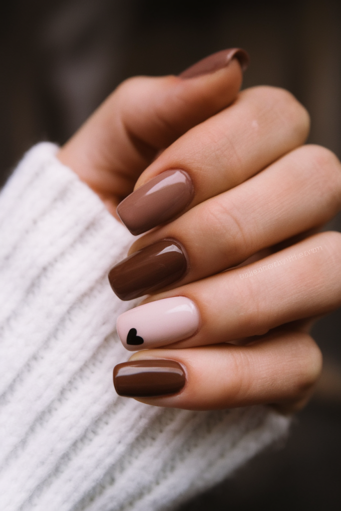 8. Cocoa-Toned Short Nails with Tiny Heart Detail
