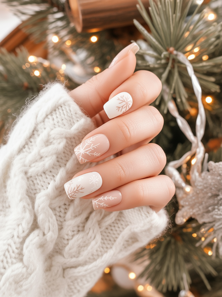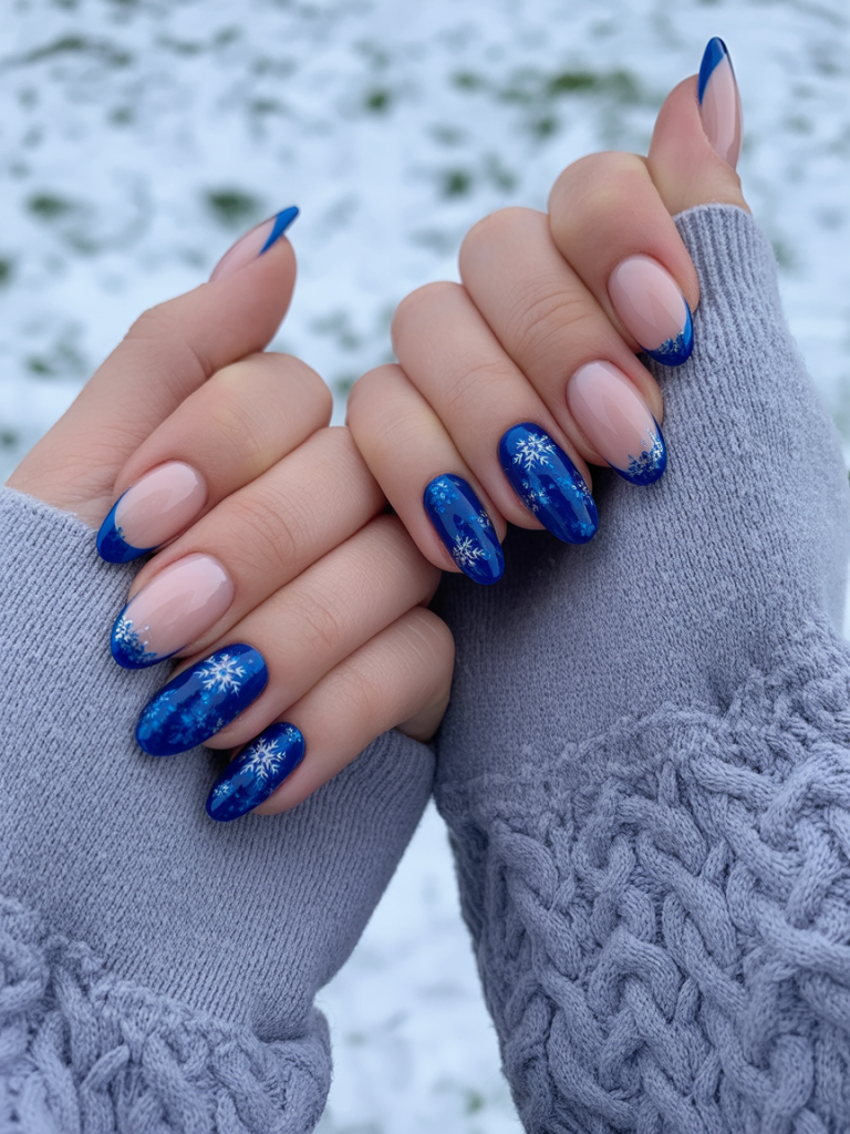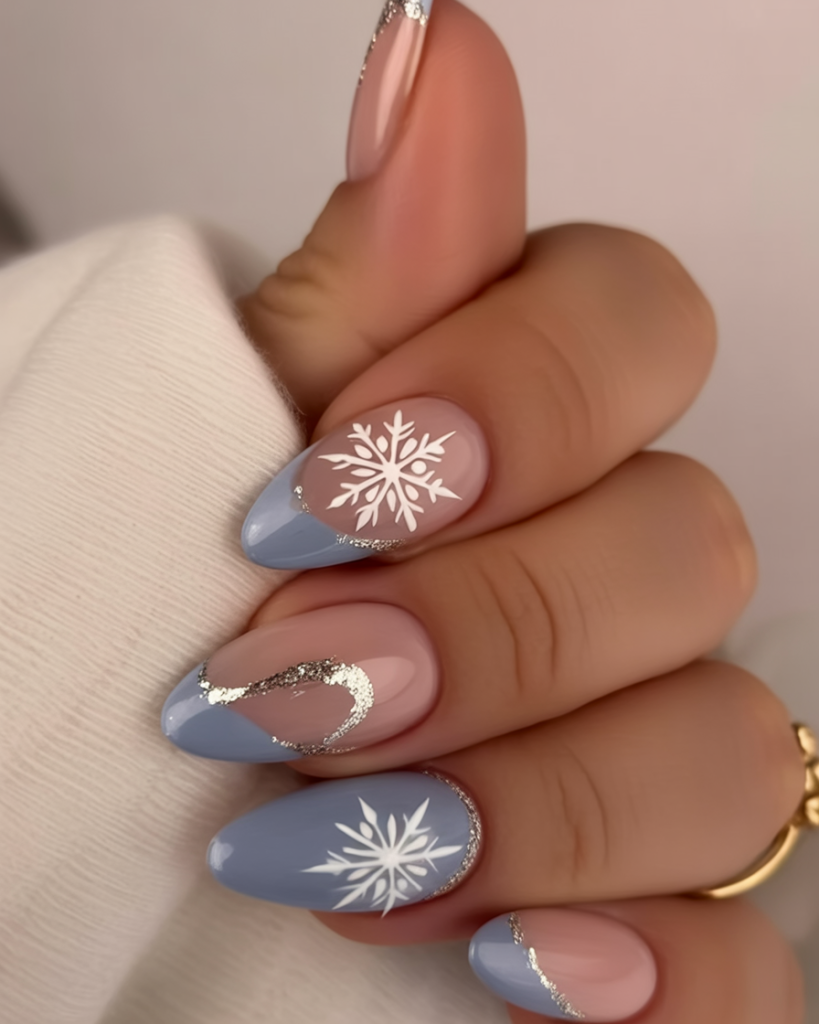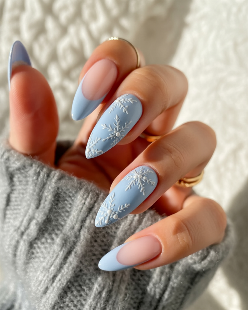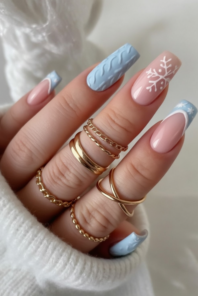 This playful mix of blue and nude nails combines snowflake art with a knit-textured accent, giving the design a cozy winter feel. The combination of patterns makes it fun and trendy, while the subtle color palette keeps it wearable. It’s festive without being overwhelming.