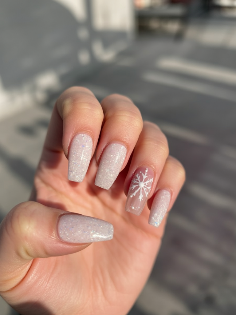 Shimmering white nails with a single bold snowflake bring a touch of frosty glamour to any winter look. The sparkly polish catches the light beautifully, making this design feel festive without going over the top. It’s subtle enough for daily wear but dazzling enough for holiday celebrations.
