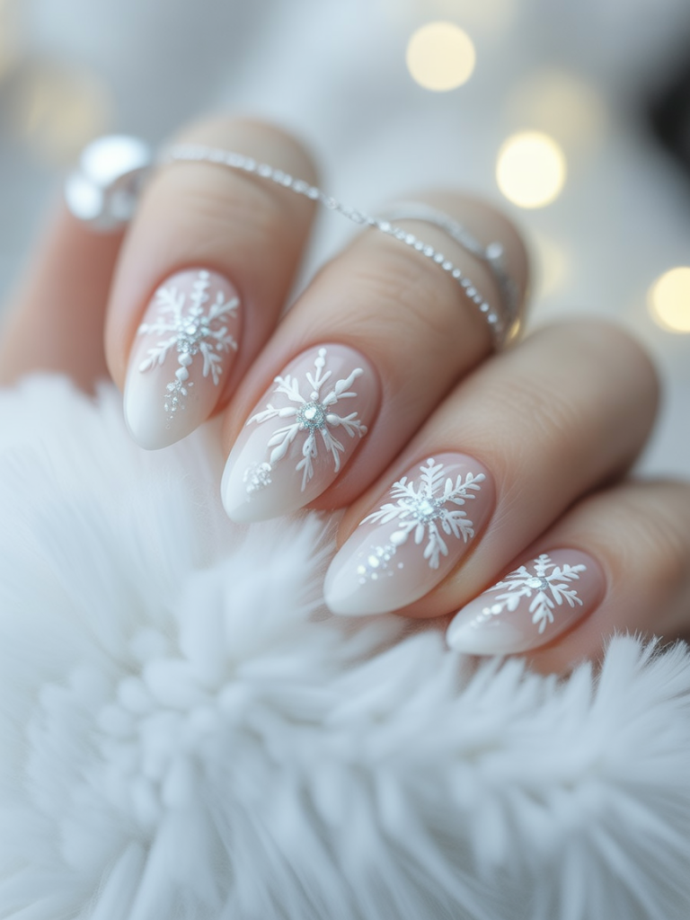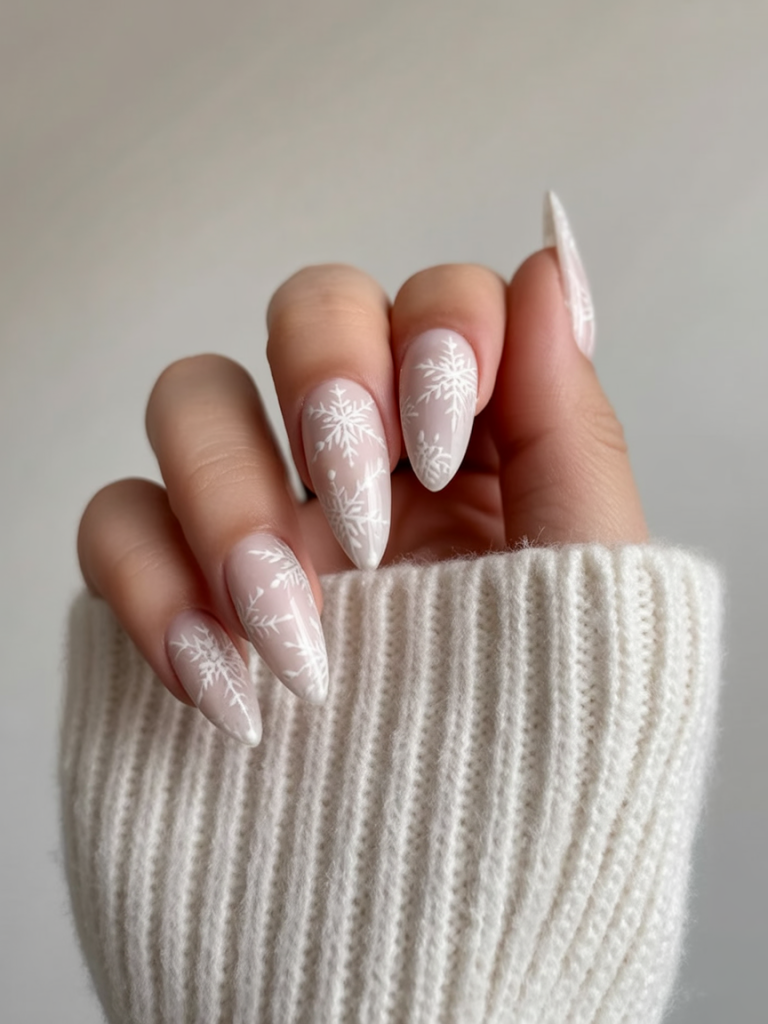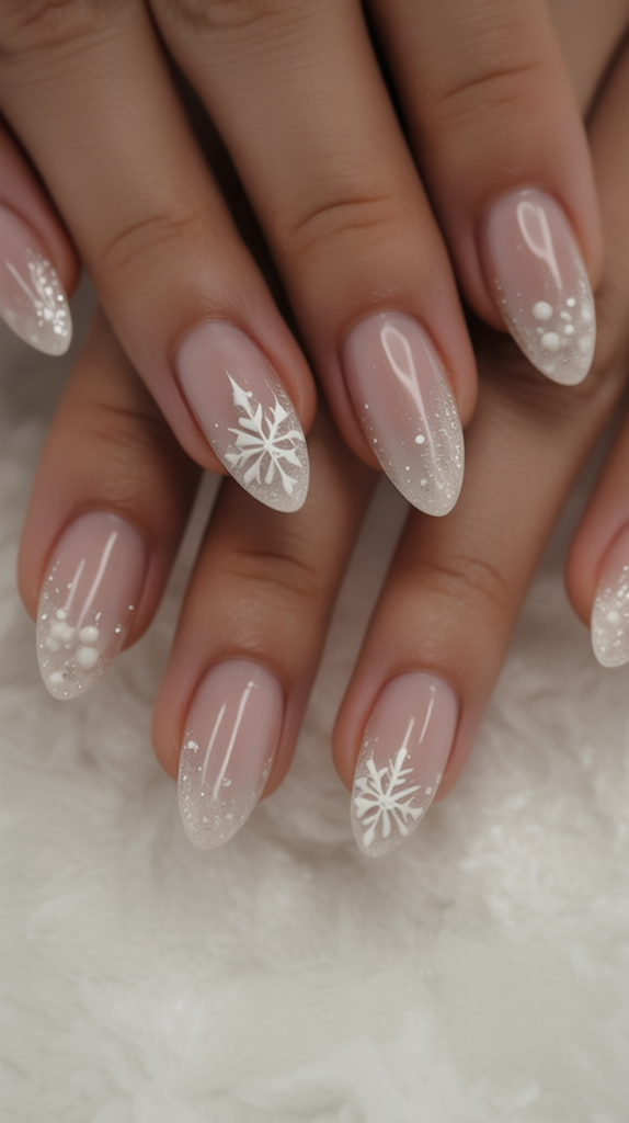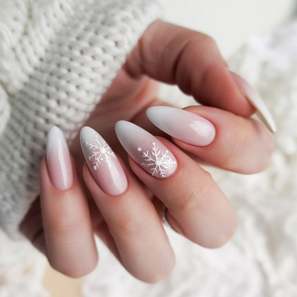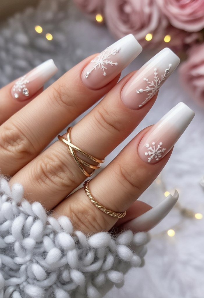 There’s something dreamy about these ombre nails where soft pink melts into pure white, creating the perfect snowy canvas. Snowflake art scattered across a few nails makes the design festive yet subtle, ideal for those who like understated beauty with a touch of winter magic.