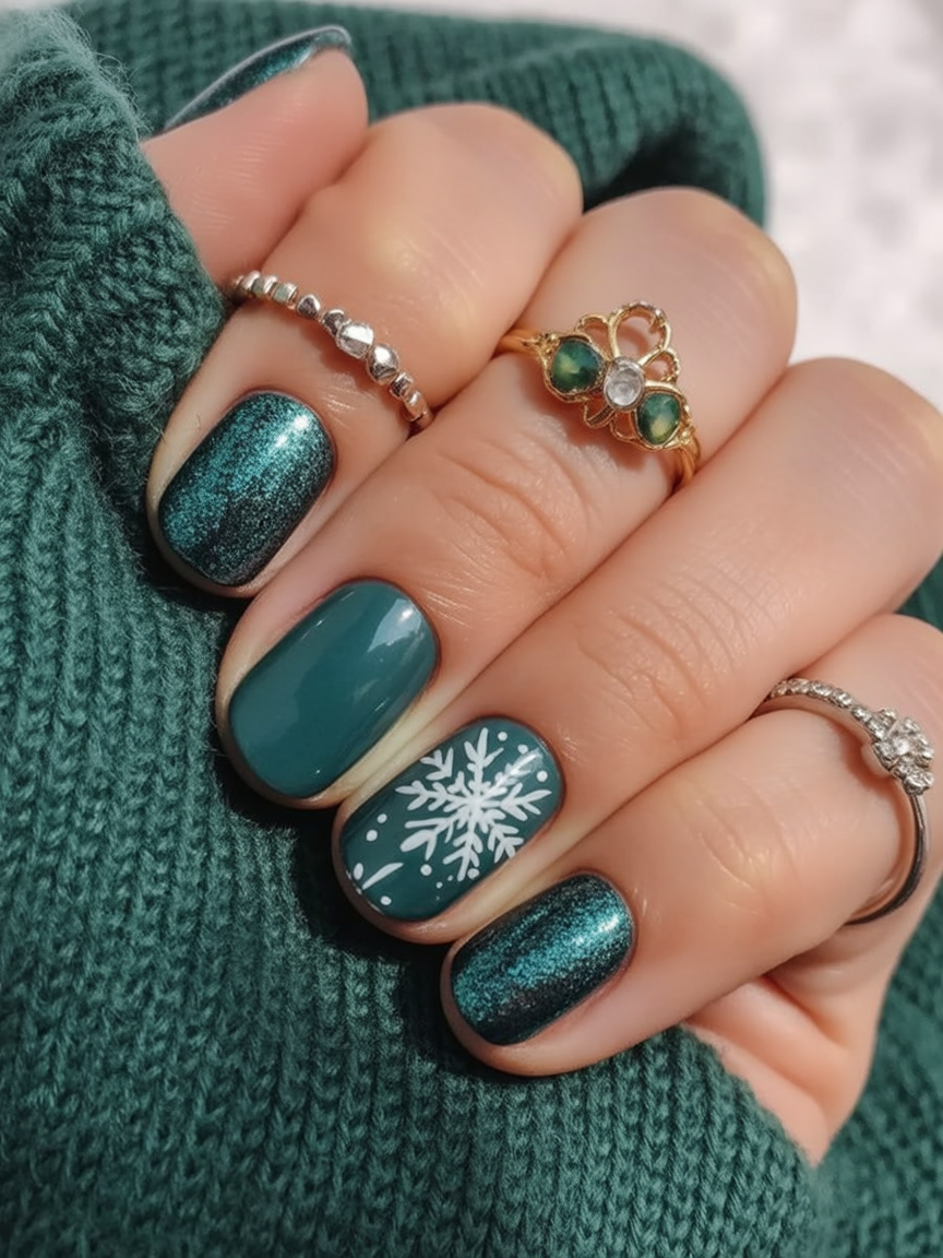 Short square nails are easy to maintain, making this a great low-maintenance inspo option. The metallic snowflake details add enough sparkle to keep it fun while still being practical. If you’re looking for easy and classy ideas, this is a strong pick.