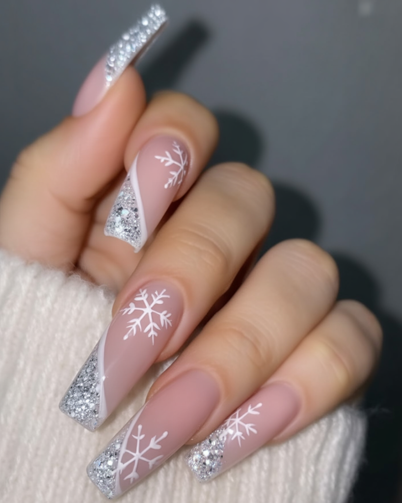 This style shines on long square nails, where the glitter tips get their full impact. The nude base keeps it elegant, while the snowflake details make it playful. If you want nails that feel both chic and seasonal, this design balances sparkle and sophistication perfectly.