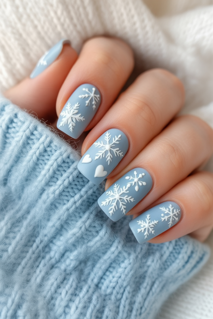 Soft matte blue paired with raised snowflake designs creates a chic, modern look that’s still full of wintry charm. The contrast of matte finish and intricate snowflake art makes the design eye-catching without being too flashy. It feels fresh, stylish, and perfect for the colder months.