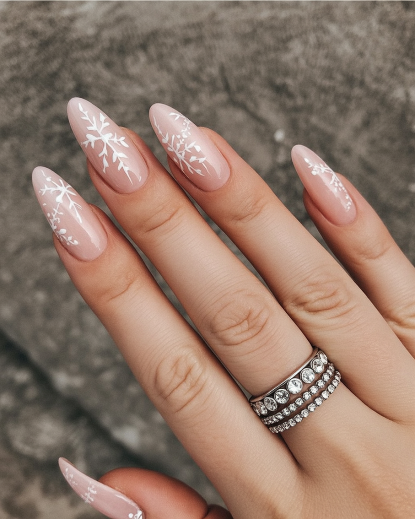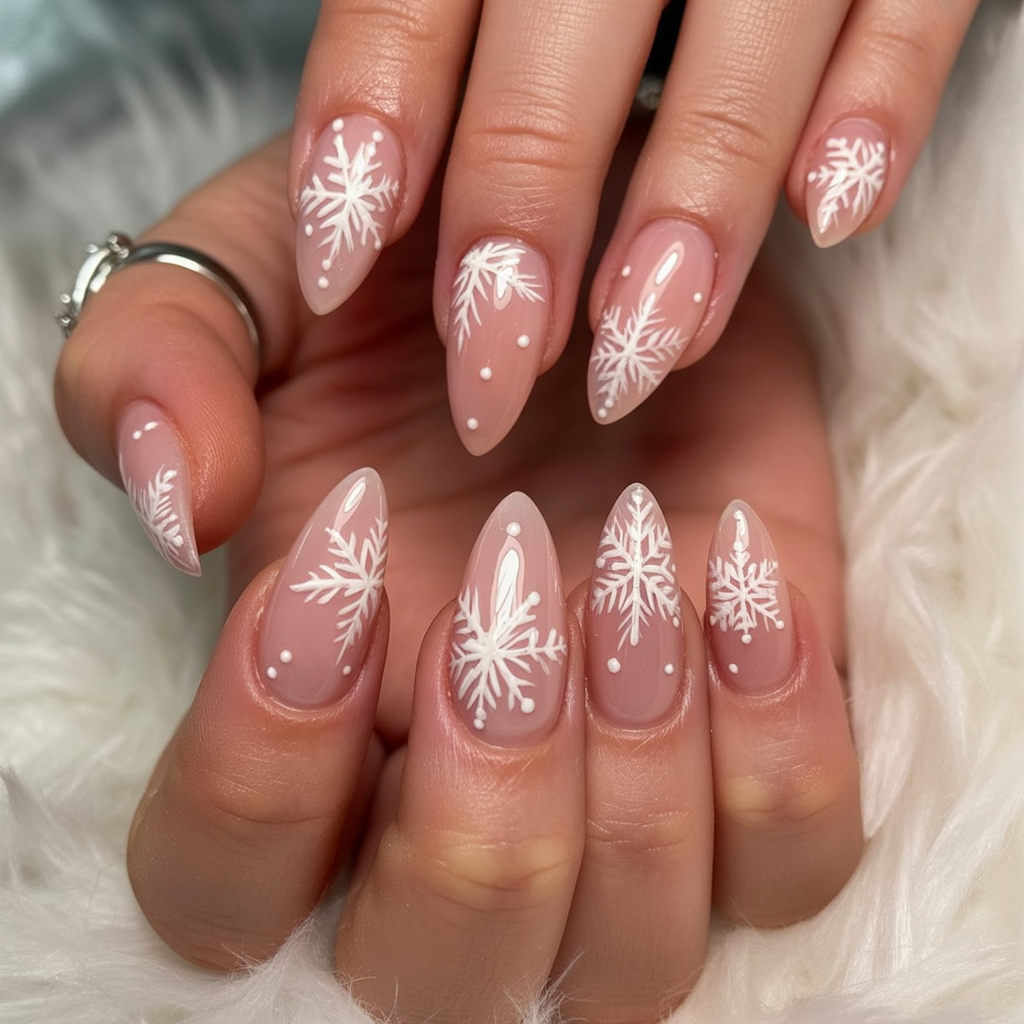 This design works well for almond shapes, adding length and elegance to the fingers. The nude base is versatile, while the snowflake art adds that winter magic. It’s a great inspo option if you want easy styling that transitions from holiday parties to everyday wear.
