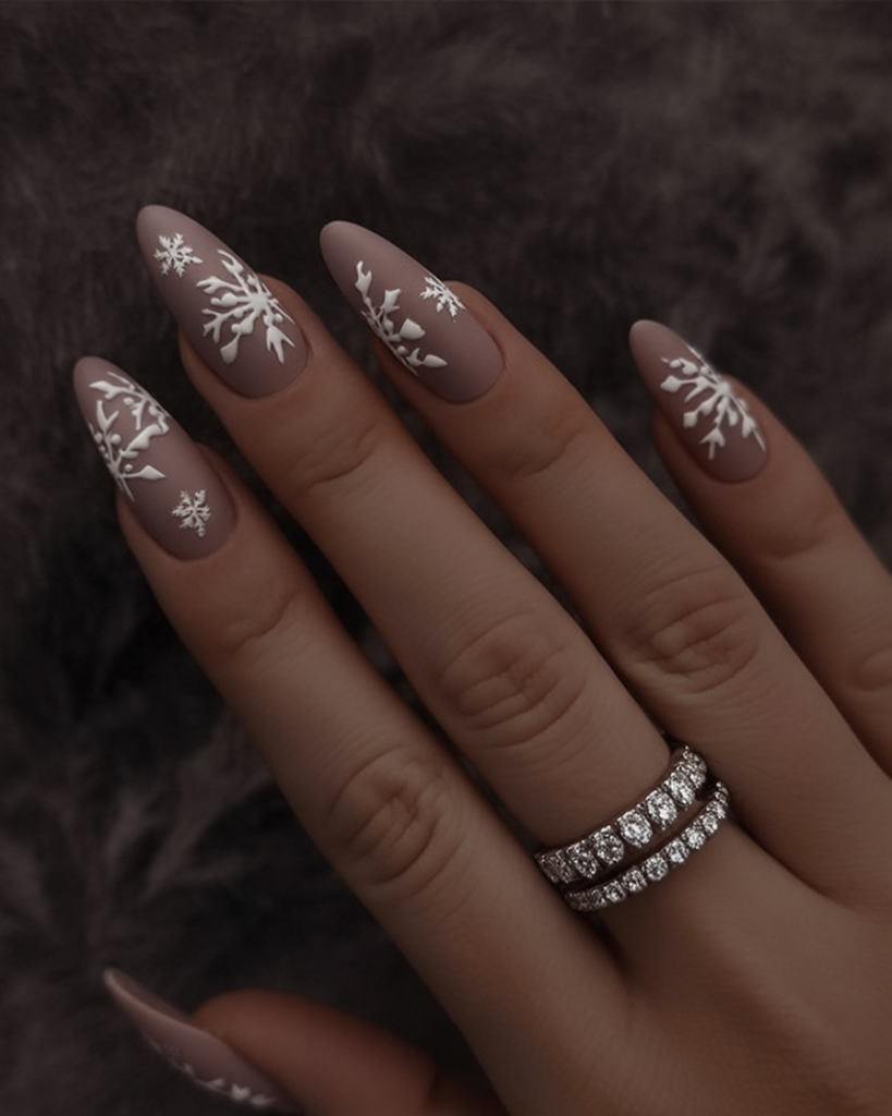 Matte brown paired with bold white snowflakes creates a moody yet stylish take on winter nails. The deeper shade adds a cozy, warm feel, while the detailed snowflake art gives the design a festive touch. It’s chic, understated, and a little bit edgy.
