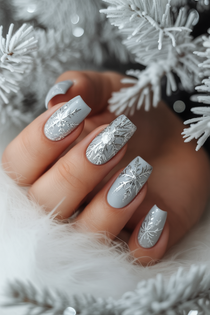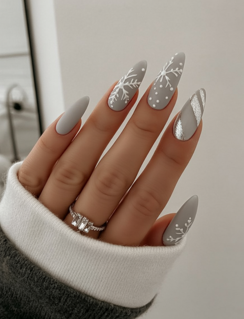 Matte grey paired with silver accents gives these nails a chic, modern edge while still keeping the spirit of snowflake art alive. The scattered dots and bold white snowflake design make them feel playful but still elegant, perfect for winter gatherings or a stylish Christmas party.