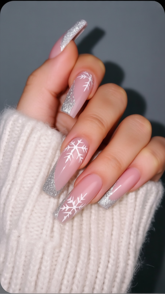 These nails combine the elegance of nude polish with bold silver tips and detailed snowflake art. The look is glamorous yet wearable, offering a perfect balance of sparkle and sophistication. It’s a design that feels party-ready without being too loud.