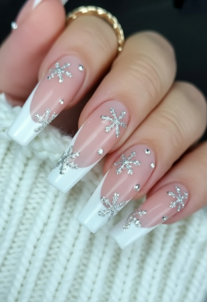 French tips get a glamorous update with sparkly silver snowflakes scattered across a clear base. This design sparkles under the light and feels festive without being too bold, perfect for holiday dinners or an elegant winter night out.