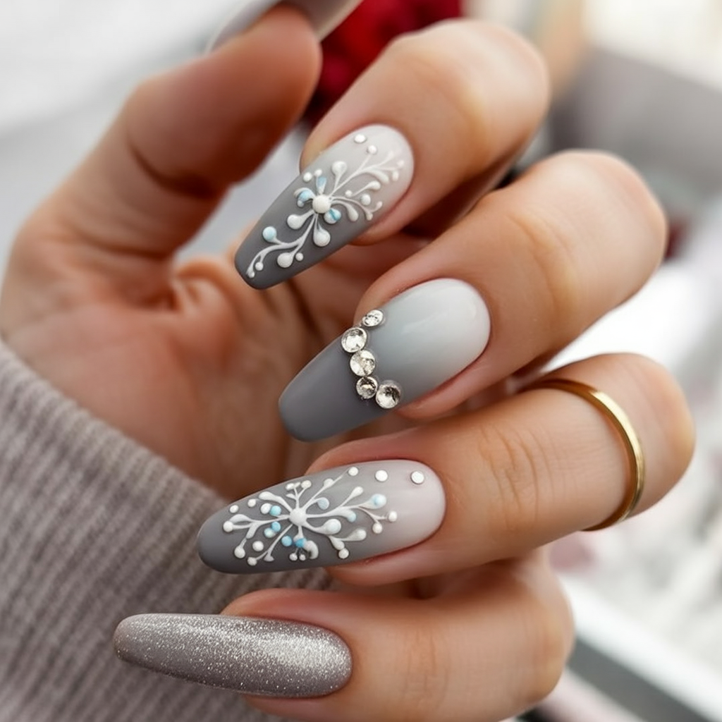 These grey ombre nails with 3D snowflake art and gem embellishments are chic and dramatic. The combination of matte finishes, shimmer, and crystals makes the design stand out as a true winter statement.