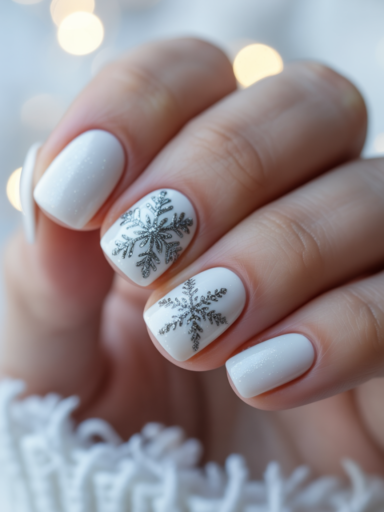 Minimal yet striking, these short nails with white polish and silver snowflake accents are perfect for anyone who loves understated nail art. The design feels festive but also very wearable for daily life.