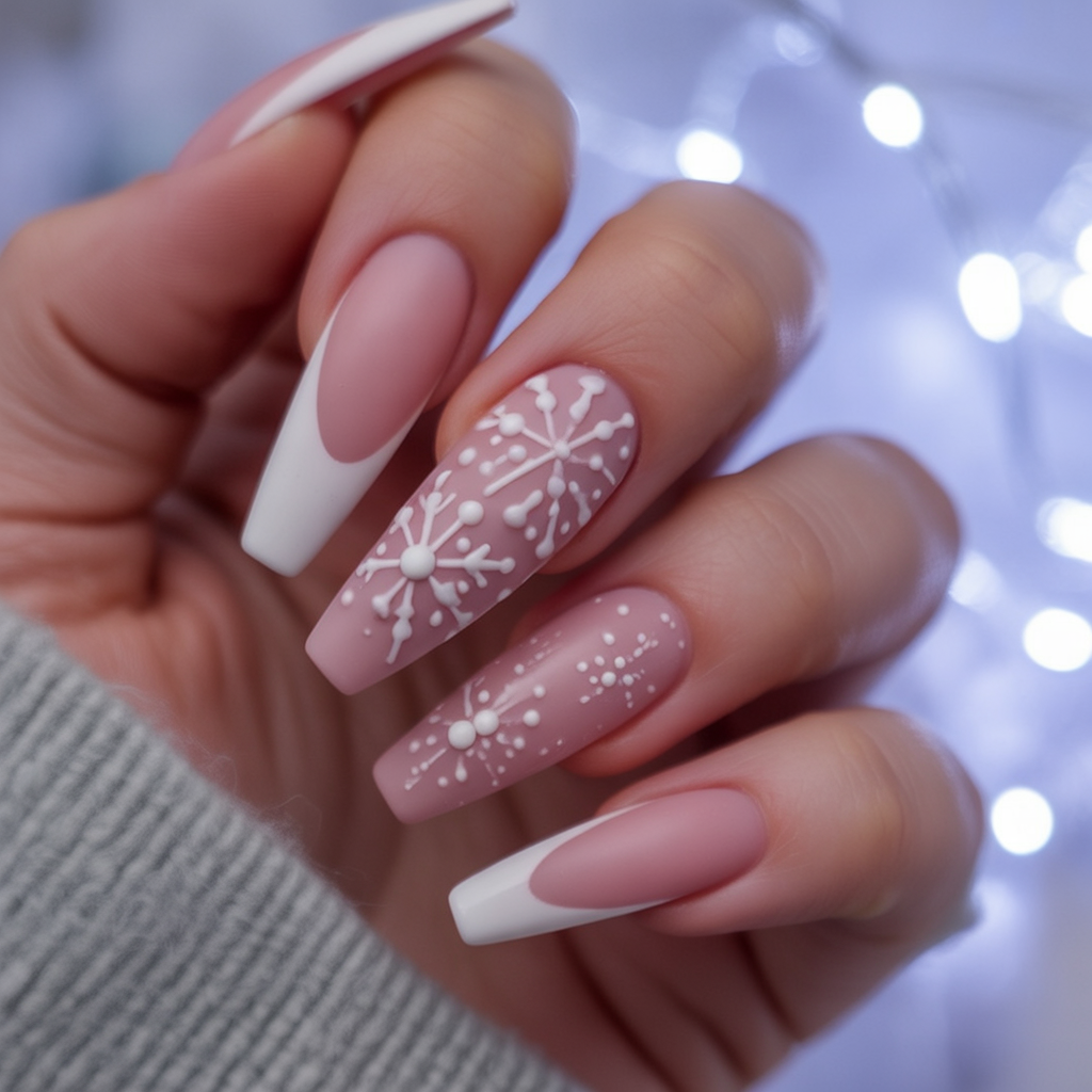 Soft pink nails with white French tips and bold snowflake designs bring a romantic twist to the winter theme. The mix of matte and glossy finishes makes this design modern and chic.