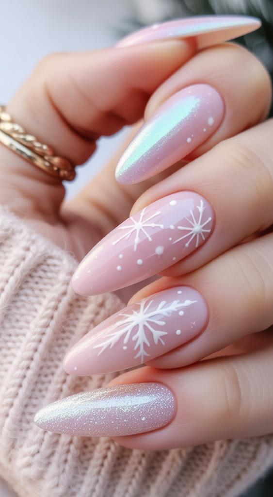 This style flatters almond nails and works beautifully for women who prefer low-maintenance art. The shimmer finish catches the light without being overpowering, and the snowflakes add a festive highlight. It’s easy inspo for anyone wanting chic, sparkly nails this winter.