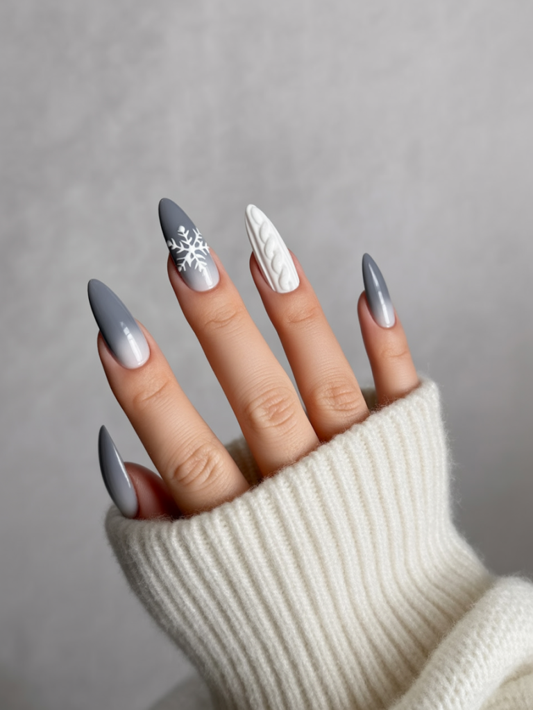 Grey tones with a knitted texture accent nail give these nails a cozy, winter-sweater vibe. The snowflake design stands out against the darker shade, adding a playful touch that feels perfect for winter evenings or a hot chocolate date. It’s a balance of chic simplicity and cold-weather charm.