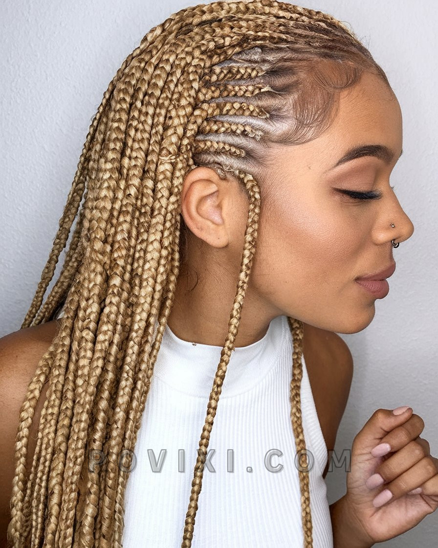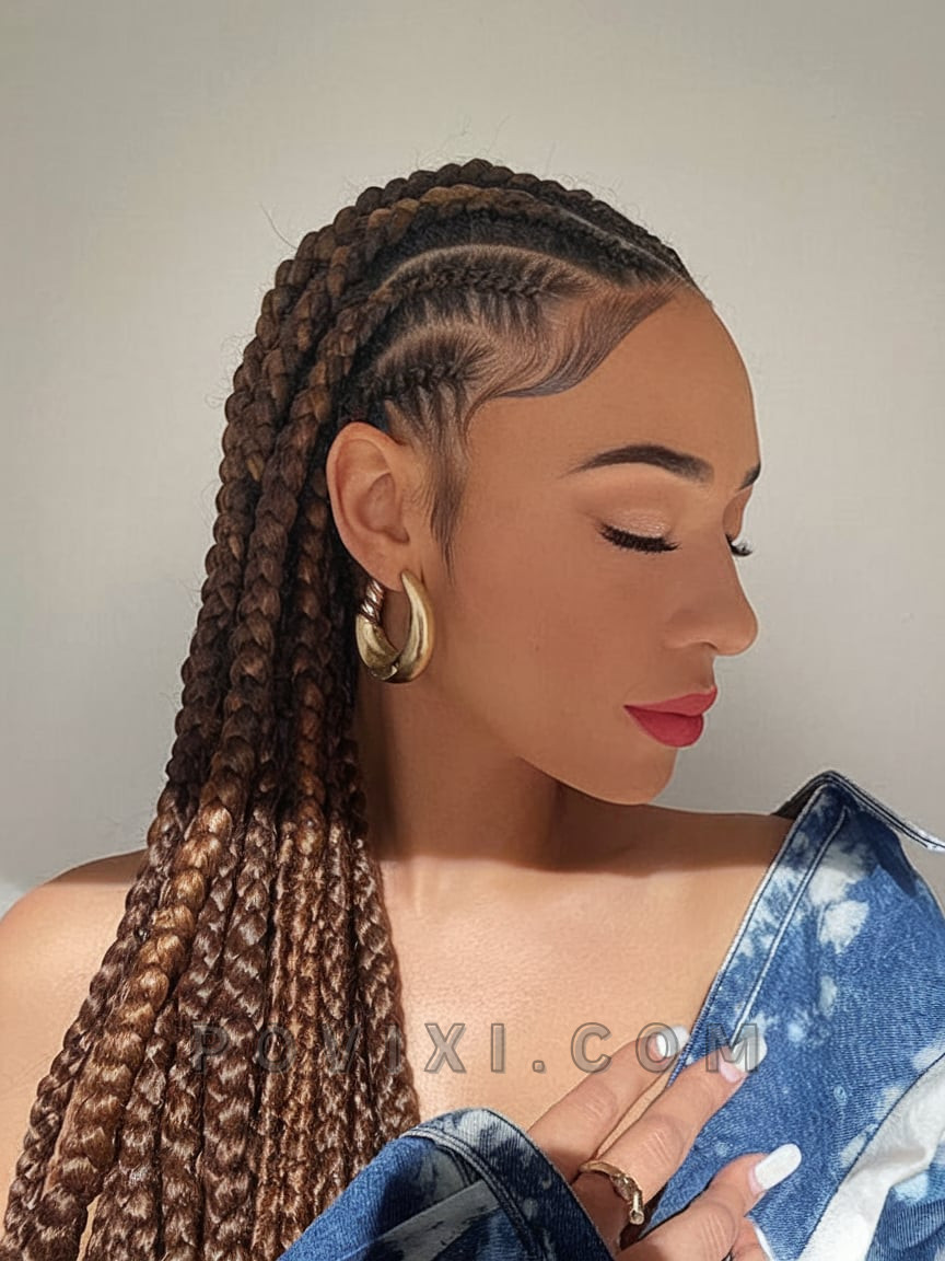 These clean, golden cornrows sweep back into cascading braids that pop against glowing skin. It’s a stunning blend of color and form—flattering on all face shapes. The lighter tone makes it perfect for summer 2025, especially for those who like sun-kissed looks that still feel grounded. A high neckline and natural glam makeup make this braid style shine even brighter.