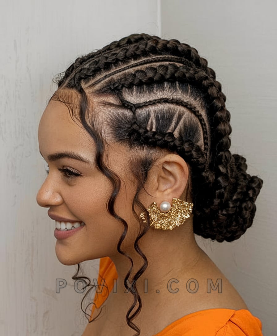 Here, tight cornrows wrap back into a rounded braided bun, accented by delicate curls left loose to highlight facial features. It’s a versatile look that easily transitions from daytime to night. If you’re a fan of statement earrings and warm color palettes, this braid bun makes the perfect frame. Bonus: it’s heat-free, elegant, and ultra-summery.