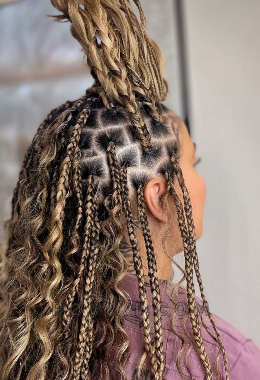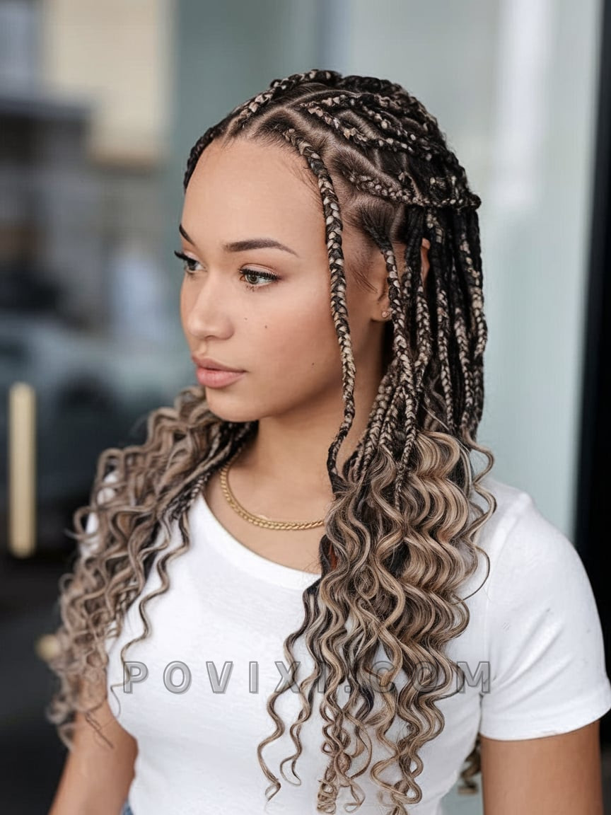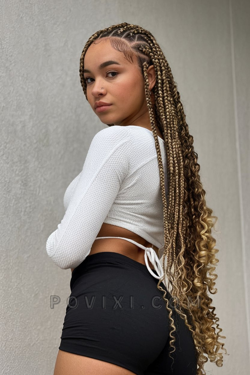 A total summer slay for 2025, this hairstyle offers a golden honey color that glows under the sun. The braids start slim and uniform, then loosen into springy curls at the bottom—giving movement and bounce. A great pick for women who love longer styles and want the perfect balance between polished and playful.