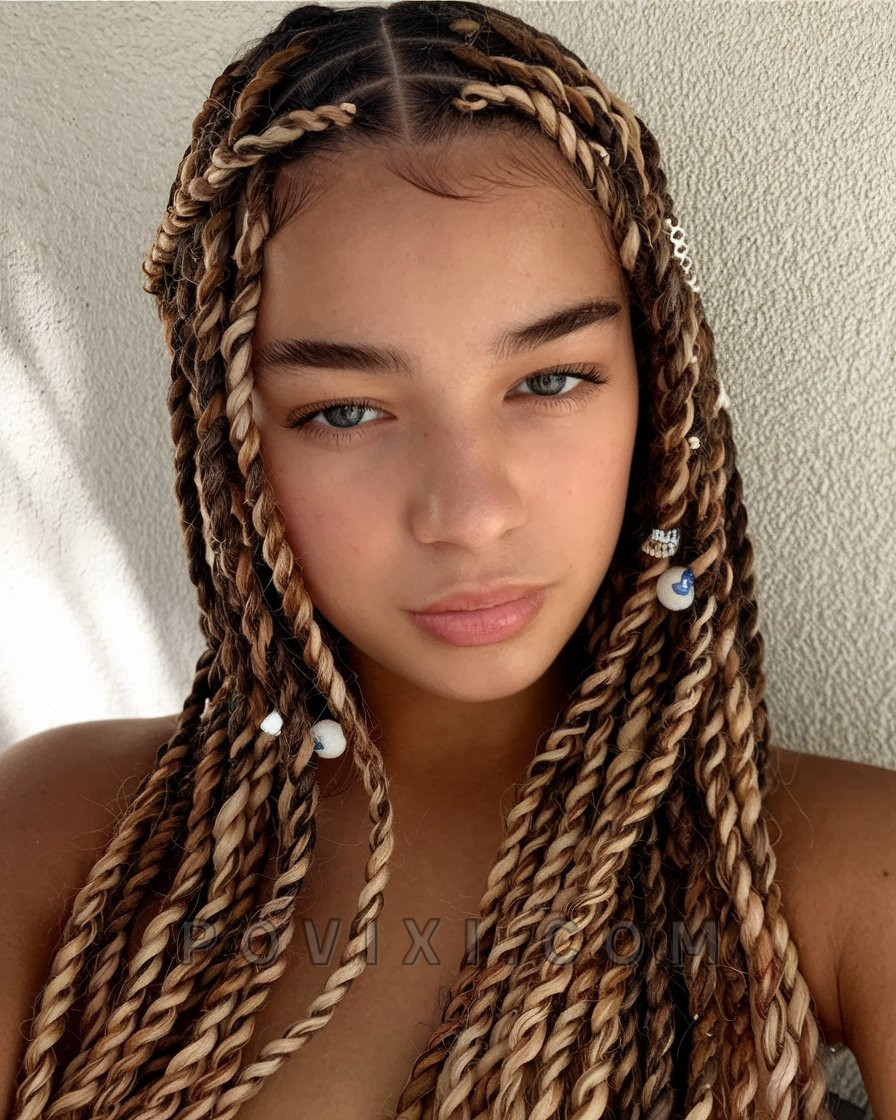 This is where culture meets creativity. These long, defined twist braids feature soft blonde and caramel strands, woven through with playful accessories with beads that add character and movement. This is a summer must for women who love to express their style with texture and tone. It feels earthy and bohemian, the kind of look that tells stories without a single word.