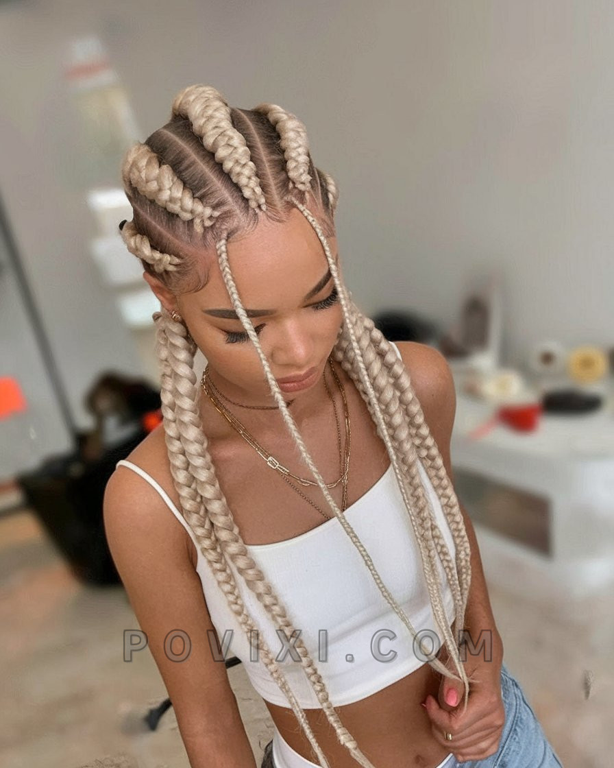 Channeling boss energy, this bold blonde braided look is all about structure and symmetry. The neat, oversized braids start from sharp cornrow parts and flow down in sleek lines, ending in long strands that frame the face. The platinum tone gives it a commanding, fashion-editor feel—one that pairs perfectly with neutrals, crop tops, and layered gold chains.
