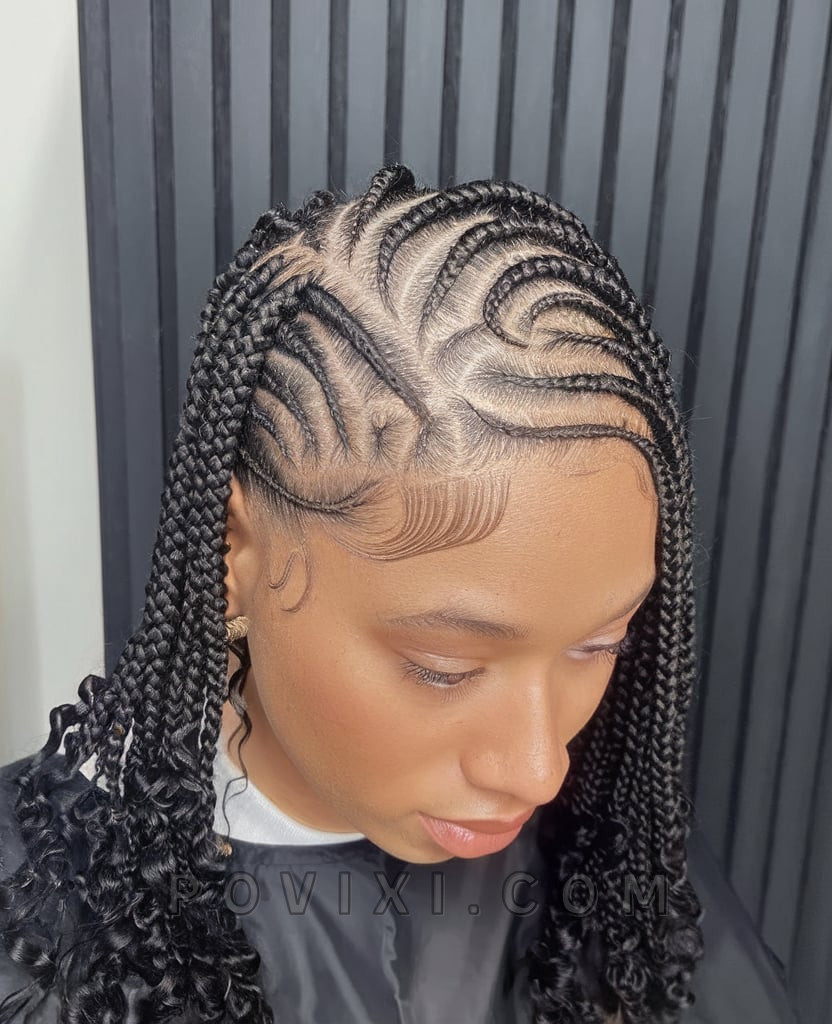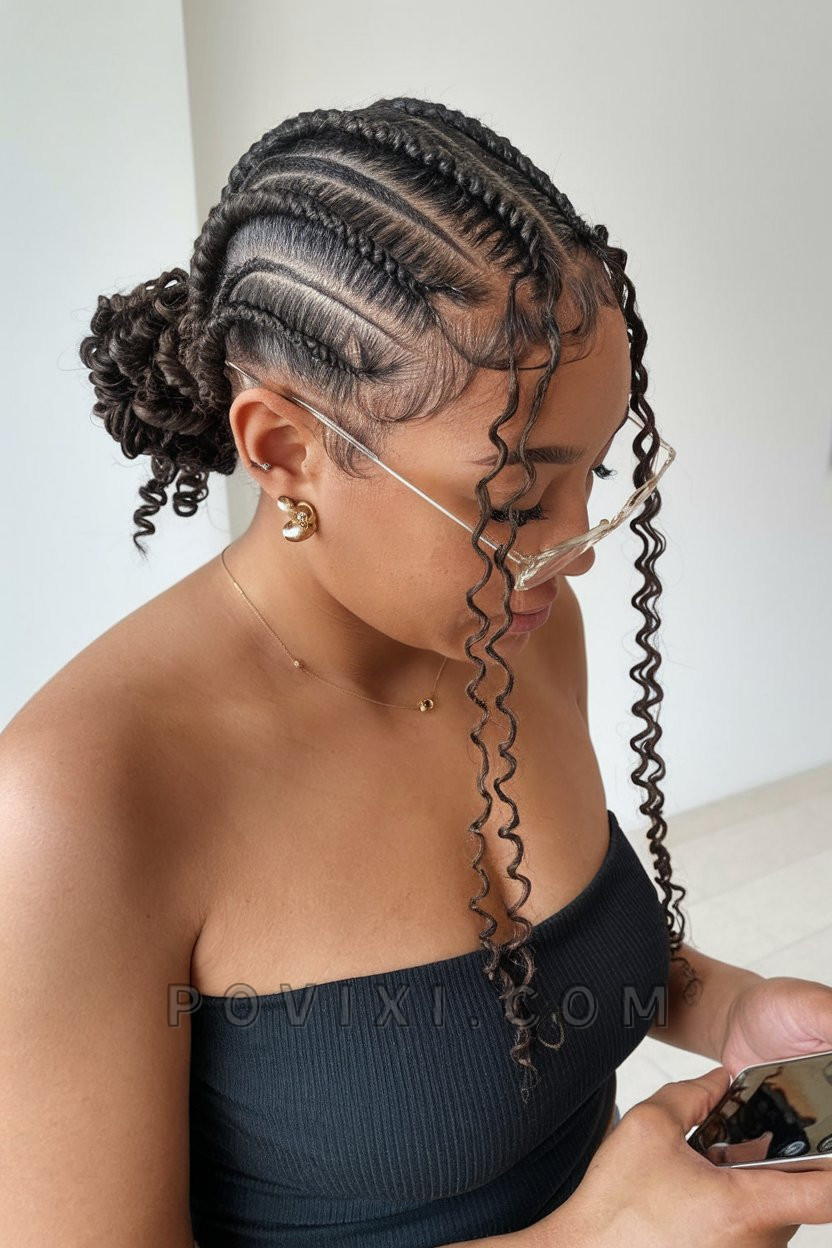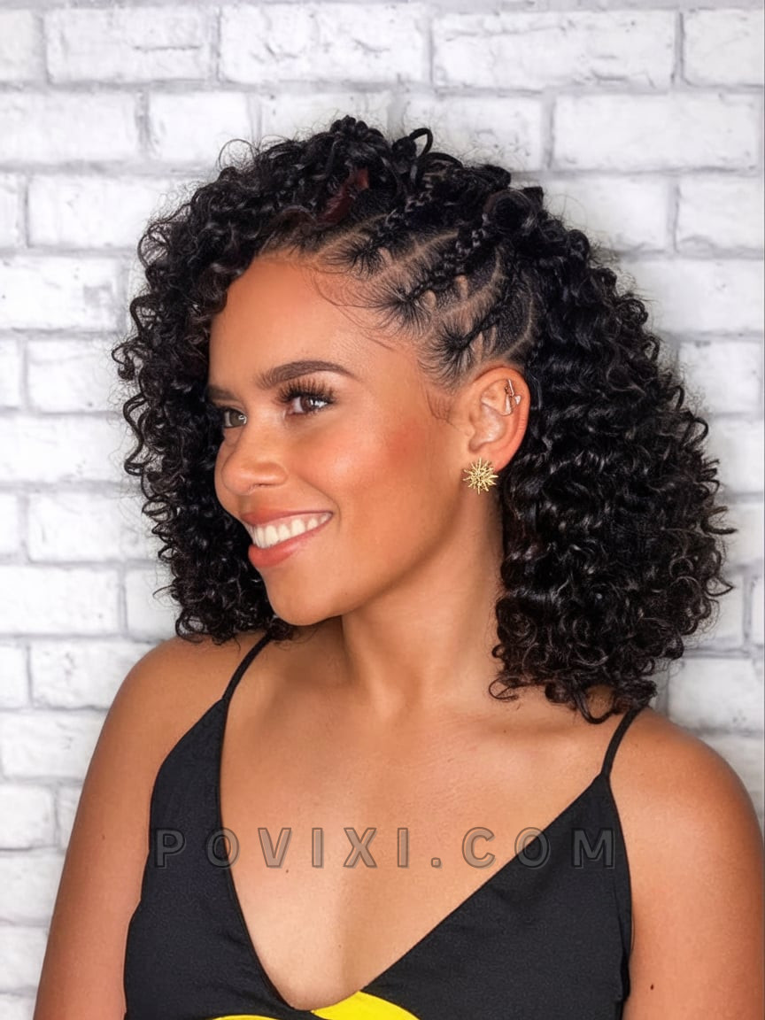This style effortlessly blends tight cornrows with voluminous, aesthetic curls that fall past the shoulders. The color contrast between dark roots and warm, honey-toned spirals gives it a sunlit vibe perfect for 2025. It’s casual enough for everyday wear but elevated enough for a date night. Think white tees, gold chains, and soft makeup to complement the carefree energy of this look.