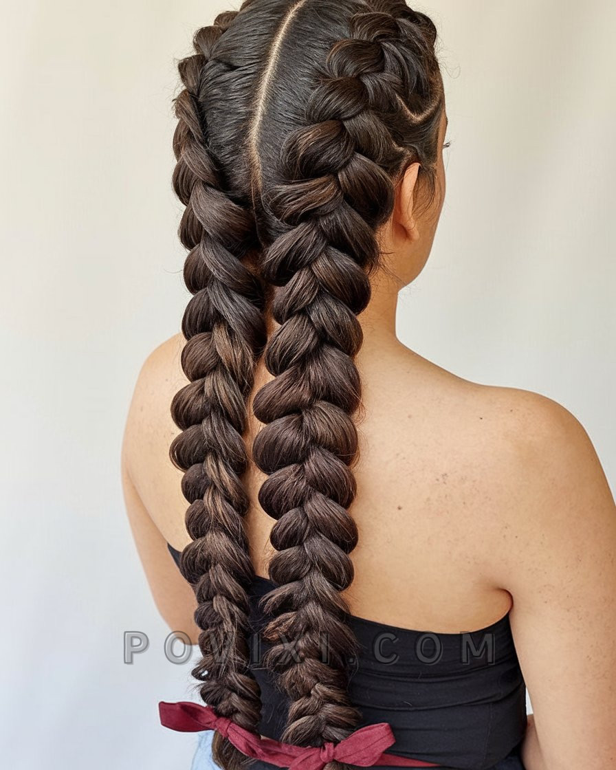 Two neatly structured Dutch braids cascade down the back, offering a simple, timeless style that never goes out of fashion. Finished with a soft ribbon at the ends, this look leans into a romantic vibe that works great for brunches, garden parties, or even a casual day at the office. It’s the kind of braid style that feels polished without being too formal—classic, cute, and effortlessly chic.