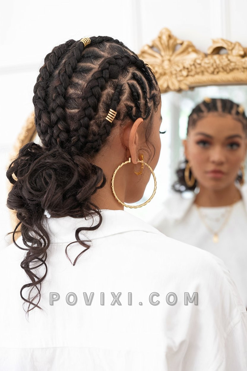 Classic with a twist, this low braided bun combines structured cornrows with romantic loose curls, finished off with gold hair cuffs for a touch of luxury. This look offers both function and flair, keeping the hair off the neck while still giving softness and bounce. It’s made for weddings, parties, and elevated nights out.