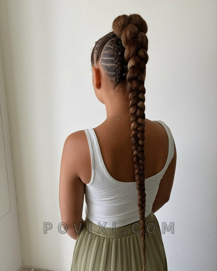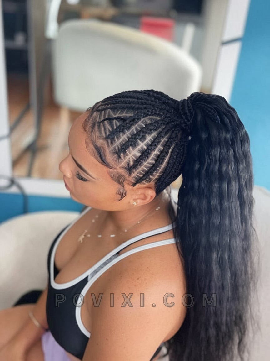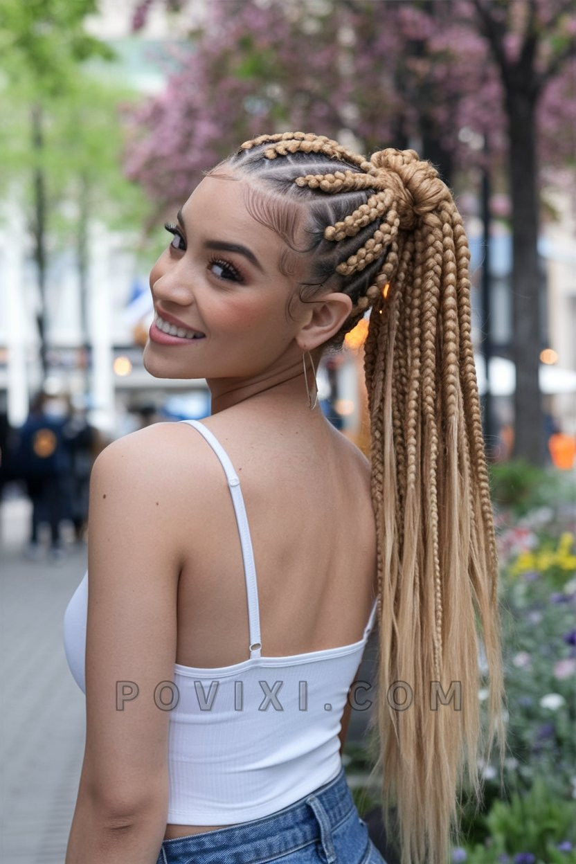 Nothing says summer quite like blonde braids that shimmer in the sun. This high ponytail with waist-length braids is a standout look for 2025, ideal for those who want to experiment with color and stand out. The golden hue flatters melanin-rich skin tones beautifully, and the with beads detail at the ends gives it that playful, boho energy. The cornrow foundation is tight and neat, keeping the look long-lasting and low-maintenance. This is perfect for festivals, vacations, or just walking through the city with confidence. Pair it with a white crop top and denim to make the hairstyle pop even more.