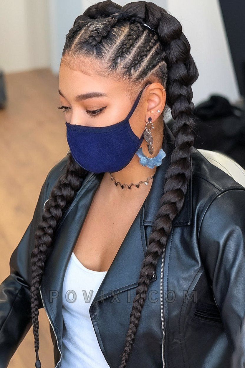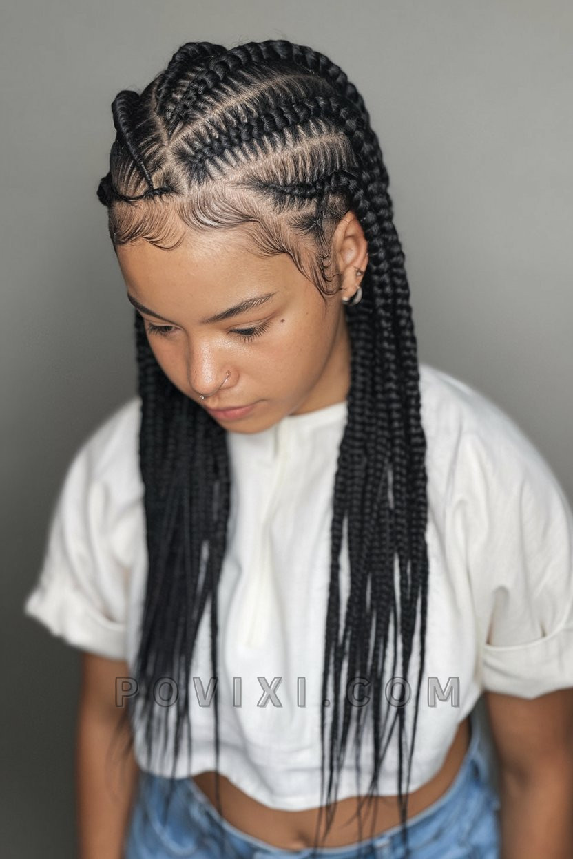 Combining micro and jumbo cornrow braids in an upward direction gives this look a royal feel. The long braids extend well past the shoulders, perfect for dramatic flair. This style stands out on vacation or at any summer event where you want to make a statement without saying a word. The detailed scalp pattern makes it extra memorable.