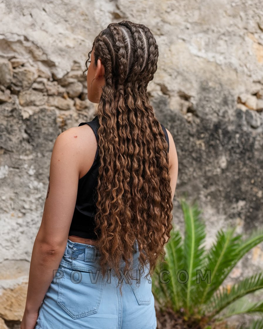 If you’re chasing that boho summer dream, this braid style hits the mark. The upper portion of the hair features tight cornrows that feed into loose, wavy lengths, offering a contrast in texture that feels free-spirited and stylish. This is the kind of look that screams summer music festivals and weekend getaways. Add in some seashell beads for a beach-ready upgrade.