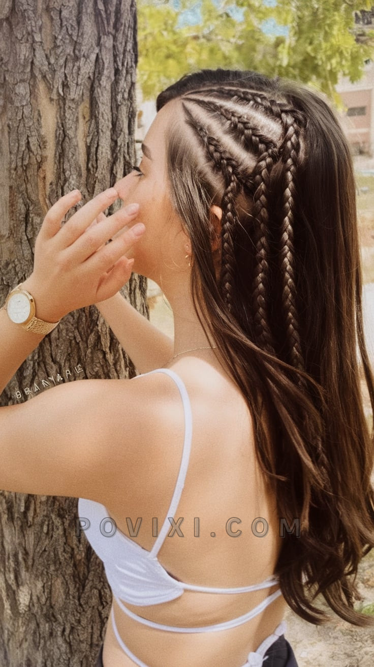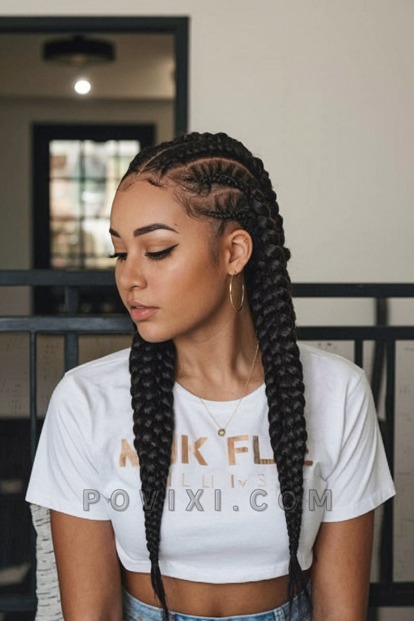 These large, symmetrical braids create a structured and powerful presence. Each section is carefully parted, giving it a clean and aesthetic layout. Great for long days under the sun, these braids keep everything secure while still allowing for head-turning beauty. Style with layered necklaces and a crop top for a modern, minimalist finish.