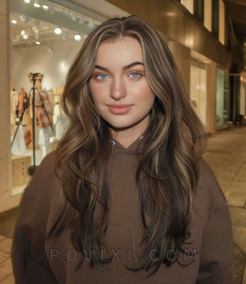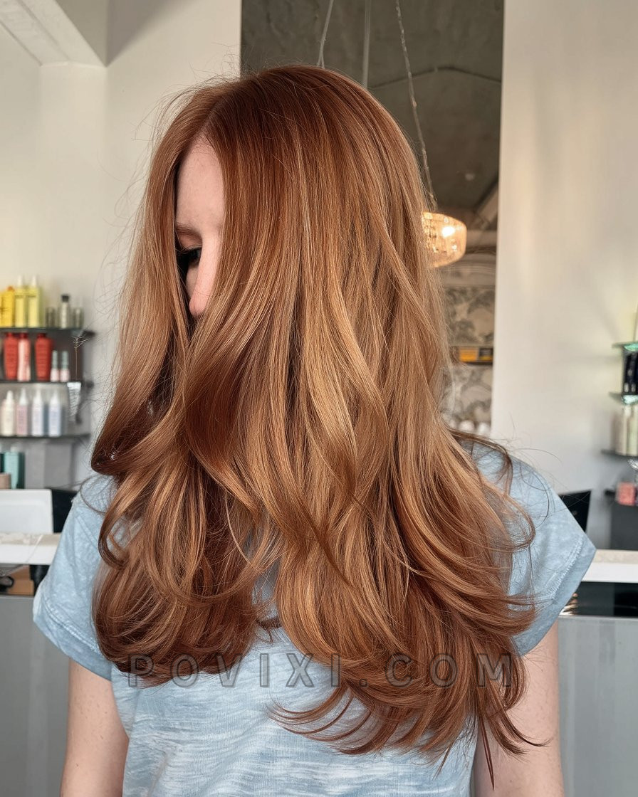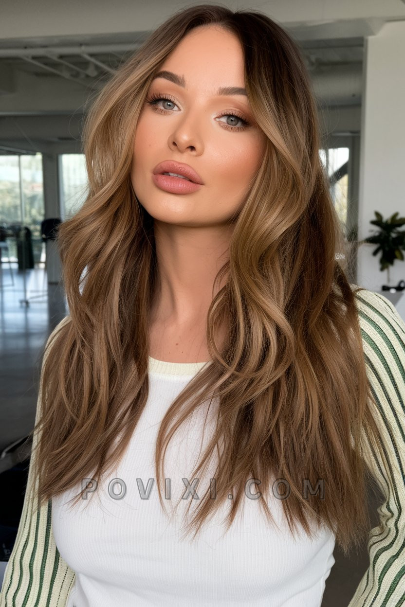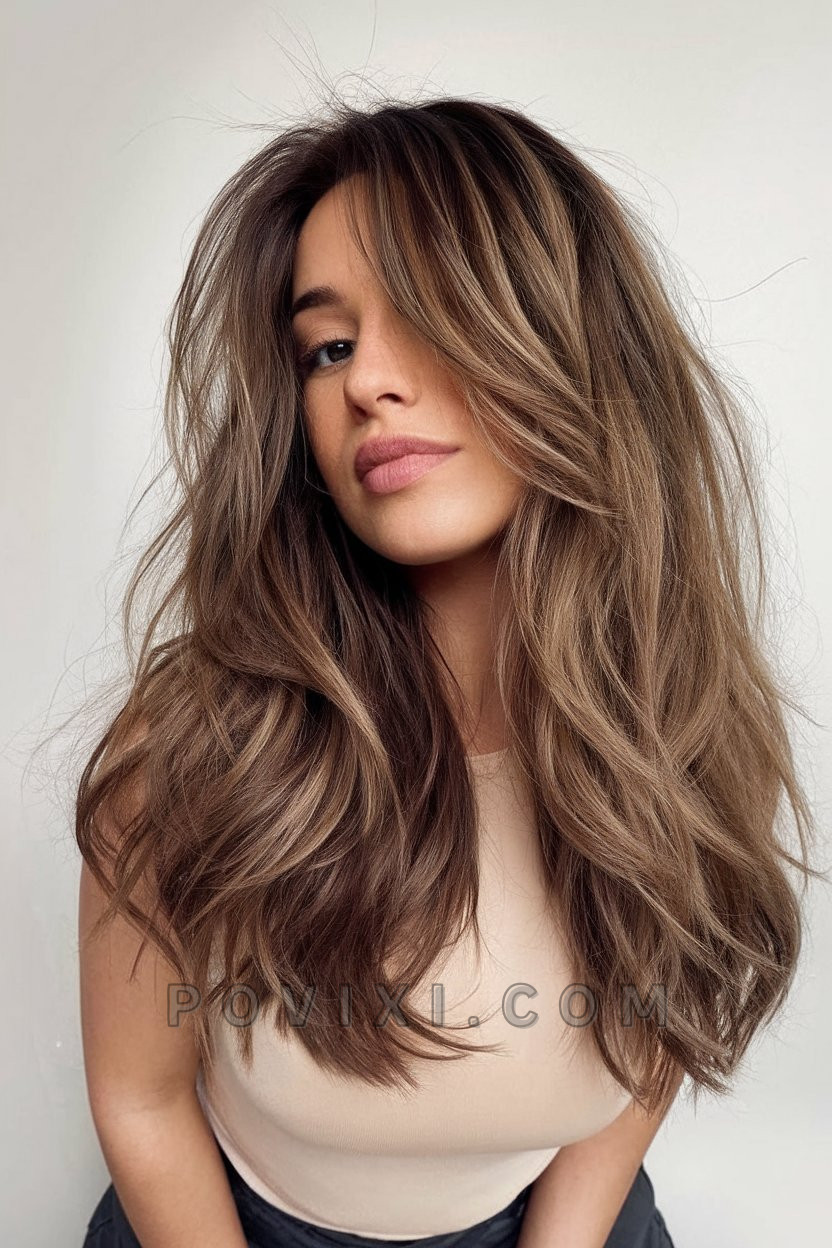 The ultimate color 2025 power move, this style stuns with rich brunette tones blended into a color caramel balayage that reflects beautifully under natural light. The haircut features cascading layers that add bounce and body, ideal for those with long hair who want to avoid flatness. The front sections softly frame the face, almost mimicking curtain bangs, making this look incredibly flattering on fair skin tones.