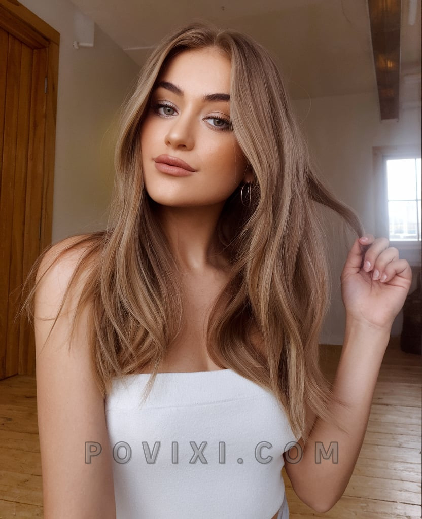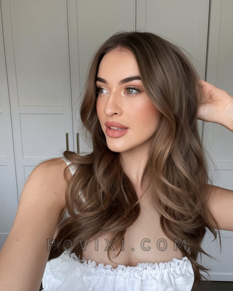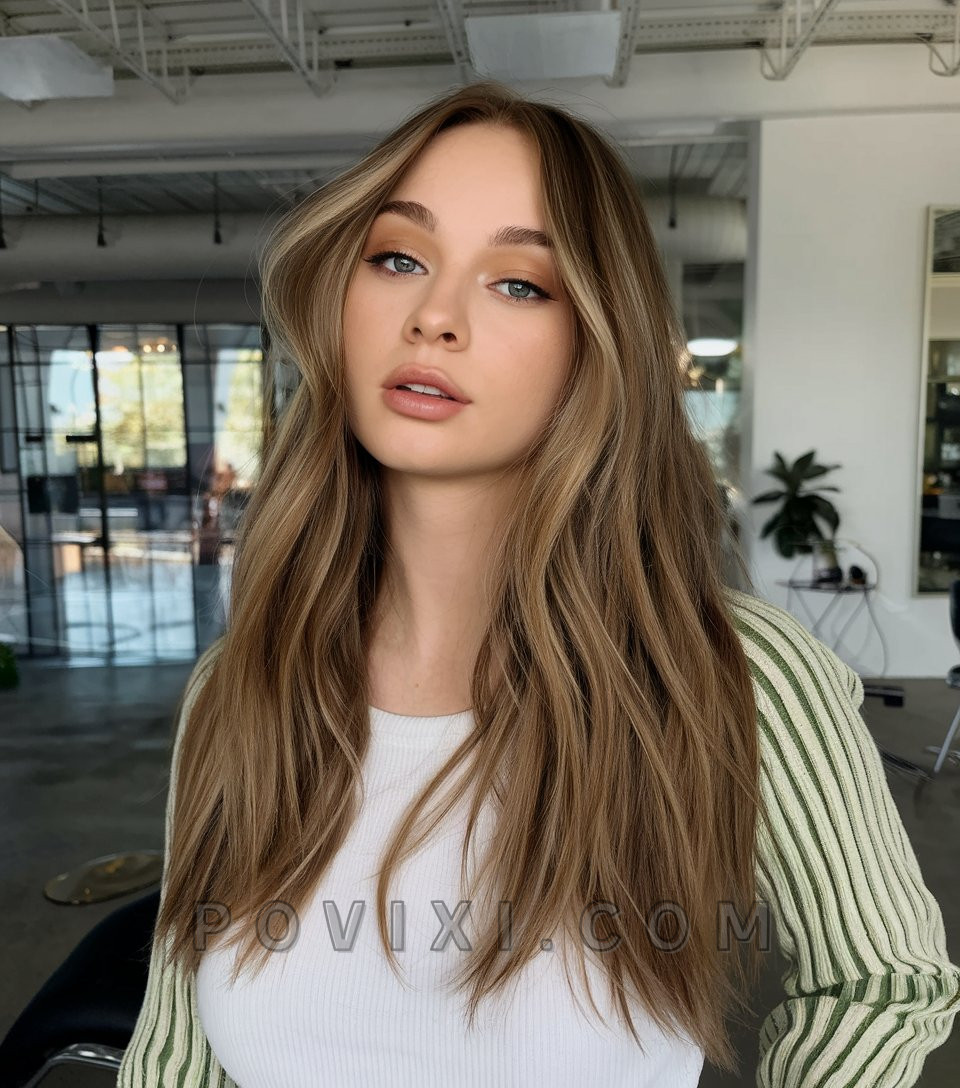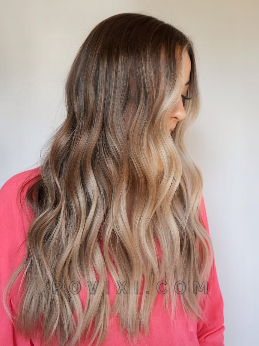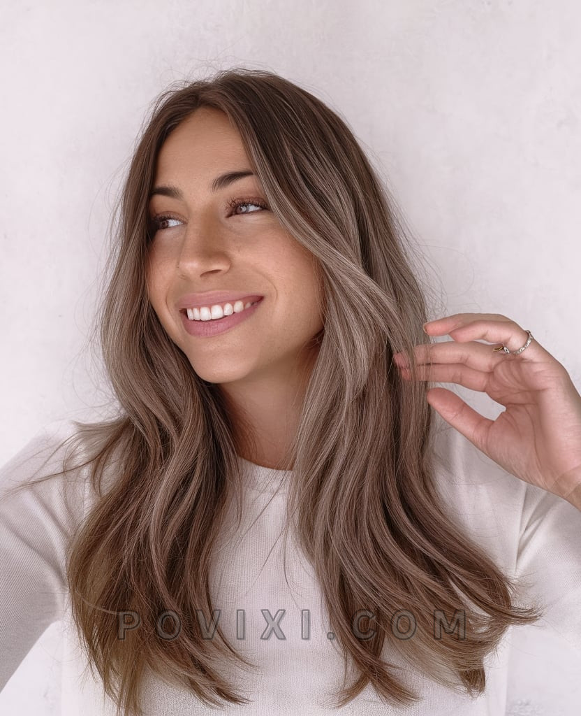 This look captures everything we love about balayage sun kissed styles—soft, glowing transitions from root to tip that mimic the natural effects of the sun. The long hair is subtly layered to add bounce and body, giving it a touch of volume while still looking silky and smooth. A soft money piece frames the face, accentuating the smile and eyes. This color 2025 choice keeps the roots dark for easy grow-out while blending seamlessly into cool, taupe-brown highlights.
